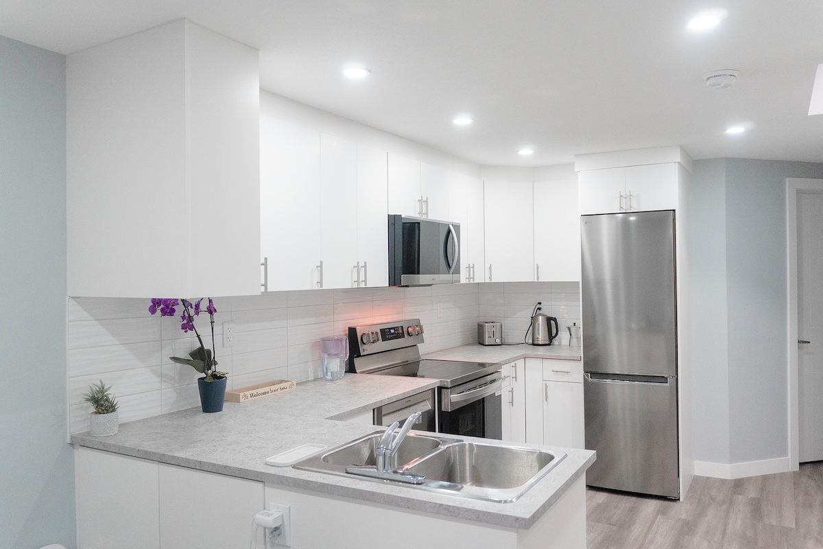 Suite con entrada privada | 2 dormitorios grandes | Cocina completa | Lavandería | Capacidad para 4 personas Relájate, refréscate, renuévate. Esta suite en el sótano, bien iluminada y espaciosa, cuenta con dos dormitorios con una cama tamaño queen y una cama doble, calefacción radiante en el suelo y chimenea ambiental. TV inteligente con cable premium y wifi incluido. Cocina de tamaño completo totalmente equipada con suministros. Ducha a ras de suelo. Lavadora/secadora en la suite. Esta suite ofrece todo lo necesario para una estancia corta o larga. Pregúntanos por nuestro descuento mensual.