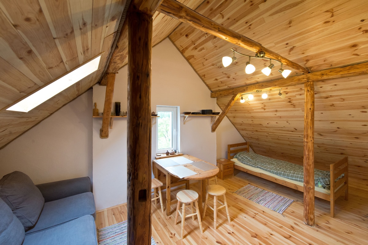 Do dyspozycji gości całoroczny domek w pełni wyposażony. Parter : salon z kominkiem i wyjściem na taras widokowy, kuchnia, łazienka z prysznicem. Piętro : sypialnia południowa z balkonem i widokiem na jezioro oraz sypialnia północna z widokiem na zalesione wzgórze i wąwóz. W sypialniach łóżka : 160/200 z możliwością rozłączenia, 140\200 oraz 80/200, pościel, ręczniki. Wi-Fi dostępne. Zamiast TV : piękne widoki, ogień w kominku. Na zewnątrz wiata z grillem, leżaki Parking przy domku.