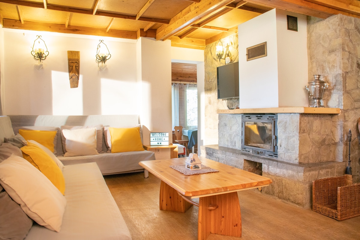 ~ Jacuzzi jest wliczone w cenę pobytu ~ Pod Srebrzystym Świerkiem to całoroczny domek z jacuzzi przystosowany do komfortowego przyjęcia 2-6 osób. Domek jest w pełni wyposażony. Do dyspozycji gości oddajemy kuchnię, sypialniane poddasze z dużym podwónym oraz dwoma pojedyńczymi łóżkami, łazienkę, a także pokój dzienny z rozkładaną dużą wygodną sofą, któremu klimat nadaje kamienny kominek. Z kuchni i pokoju można podziwiać bajeczne górskie widoki.