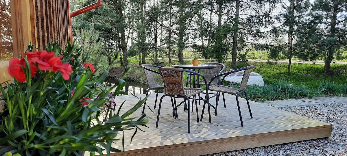 Nueva casa de madera de 75 metros cuadrados donde se encuentra el dormitorio, la sala de estar con cocina, la habitación del wc. Se proporciona una gran terraza con muebles cómodos para los huéspedes, hay una gran parrilla, jacuzzi en la propiedad. La casa puede acomodar hasta 5 personas. La cabaña es perfecta para viajeros extranjeros, justo después de entrar en Lituania desde Polonia. Columpios listos para niños, caja de arena, trampolín, piscina de bolas, karting. Se puede llegar al lago Oria a 7 km con un cómodo acceso para adultos y niños. Llámanos.