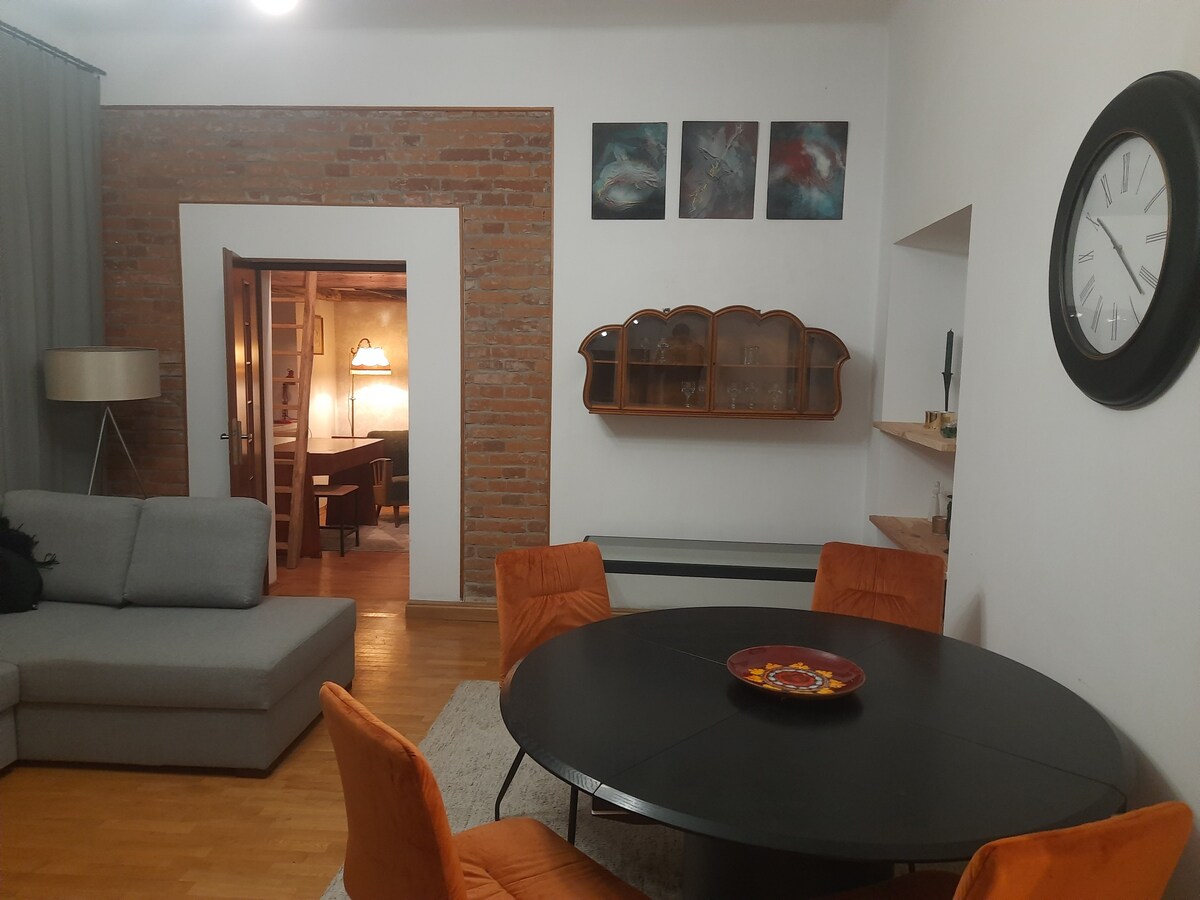 Todos los huéspedes pueden disfrutar de los interiores espaciosos e inusuales aquí. El apartamento de dos niveles en el centro de la ciudad es un amplio apartamento de 100 metros cuadrados en una casa de vecinos histórica, decorado con un estilo único que combina historia con modernidad. El interior está decorado con vigas de entrepiso de roble de más de 100 años, vigas estructurales de alerce en el ático y una chimenea climática, que crean una atmósfera única.
