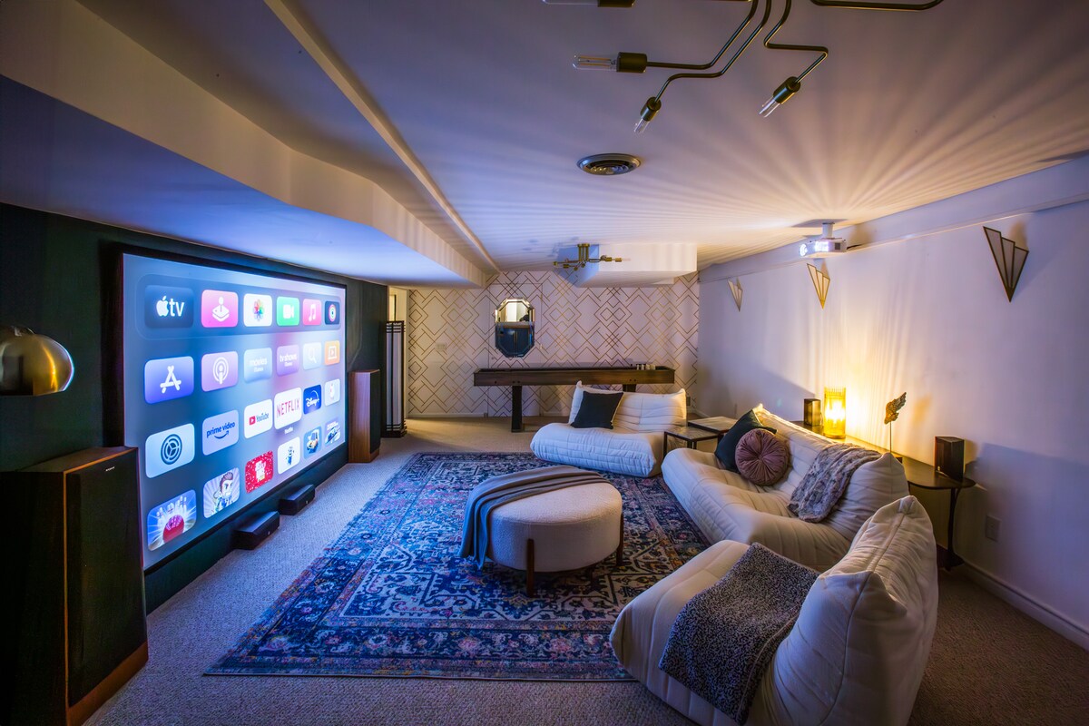Sótano privado Dapper Deco • Pantalla de 120 pulgadas y juegos