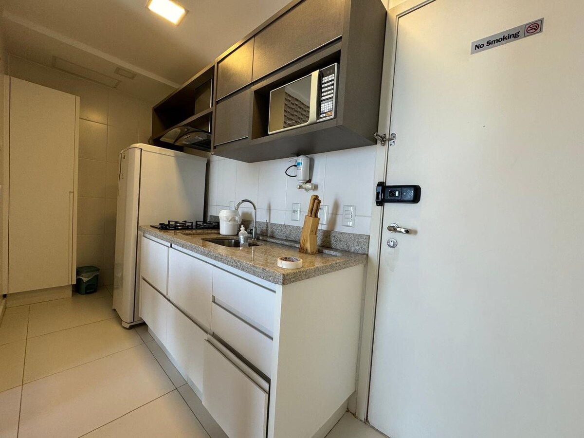 ¡Apartamento único y acogedor! Con 1 dormitorio, 1 cama queen, totalmente amueblado, excelente ubicación, con Wi-Fi, 2 televisores inteligentes, electrodomésticos como microondas, cafetera, filtro con agua fría, plancha, secador de pelo, ropa de cama y baño y garaje privado. Área de ocio completa con piscina climatizada, sauna, jacuzzi, gimnasio, lavandería, y en el centro comercial hay excelentes restaurantes y cafeterías. Junto al mejor centro comercial de Goiás, Flamboyant Shopping.