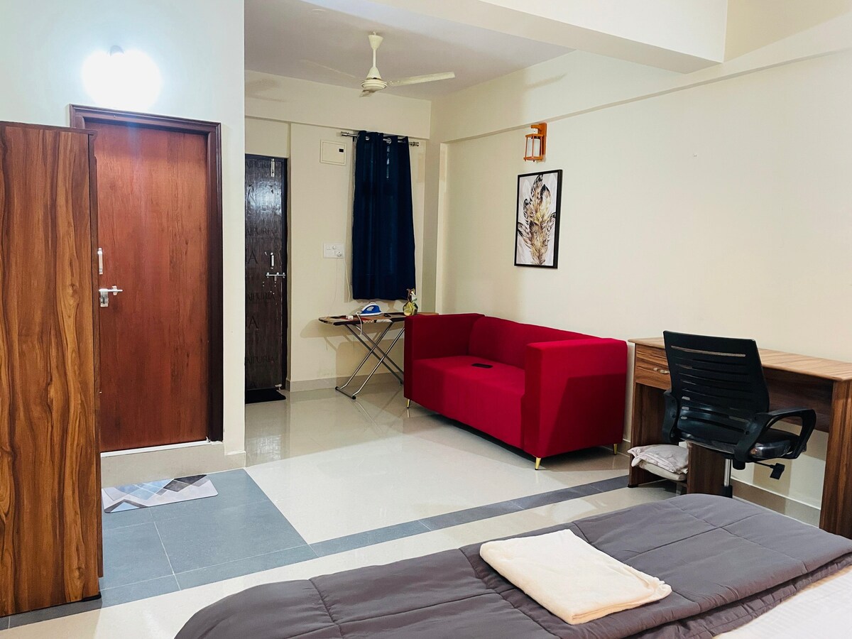 Un estudio cuidadosamente diseñado por mí, que ofrece pura elegancia y funcionalidad, lo que te hace sentir como en casa y cómodo. Guardia masculina/mujer las 24 horas A poca distancia a pie: Restaurantes. Paradas de autobús Solo estás: 15 minutos - HYD Centro de la ciudad A 19 minutos del aeropuerto (RGIA). 26 minutos - Hitech City / Distrito financiero / Embajada de EE. UU. Tu estadía incluye: Estacionamiento Snacks Bebidas frías/calientes Toallas Baño privado Géiser acuático Sin chinches Servicio DE limpieza Refrigerador Hervidor eléctrico. Aire acondicionado Respaldo de electricidad las 24 horas