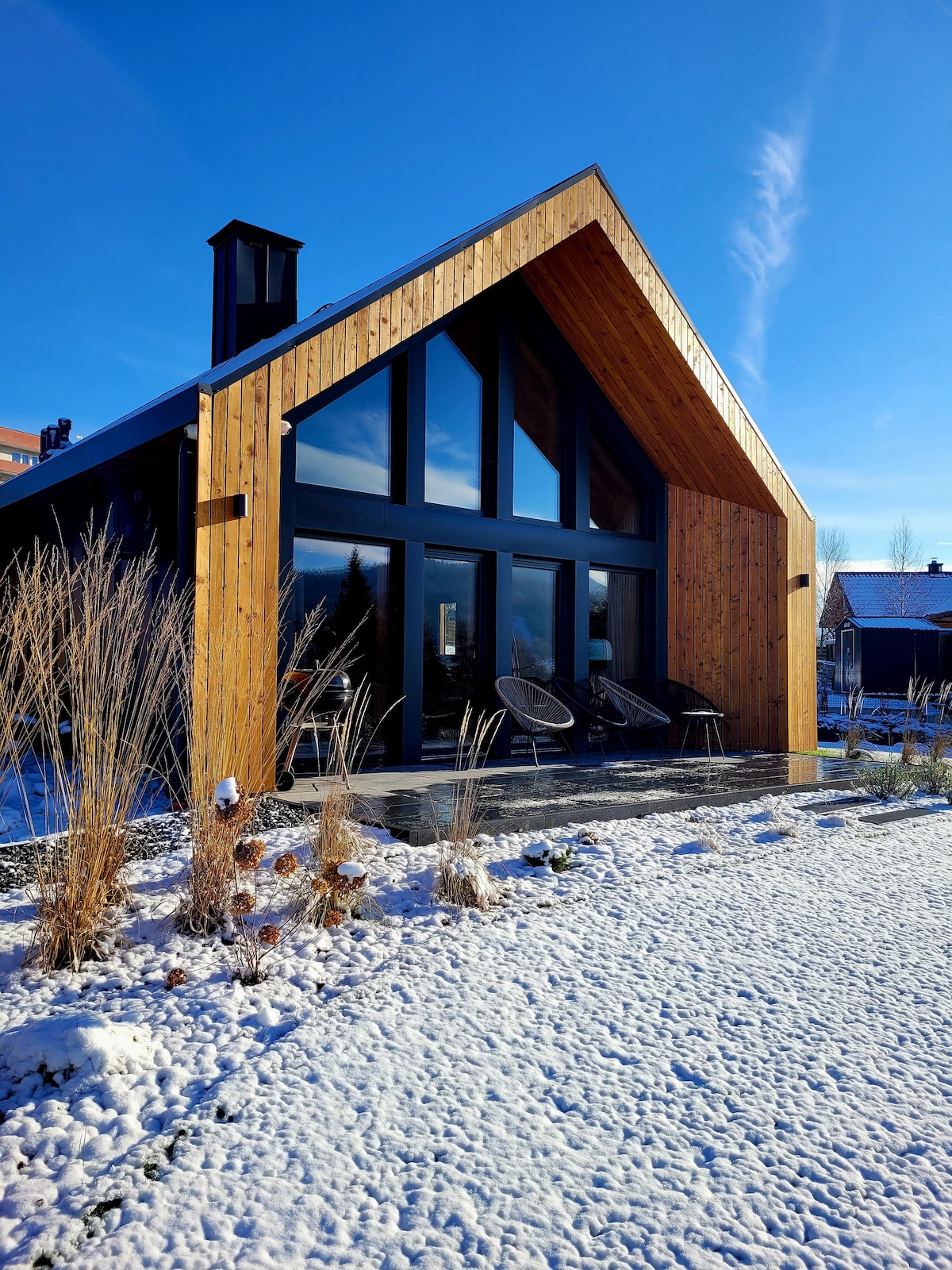 Te invito a Chabrowa, la casa en el lago Klimków, rodeada de bosques y las colinas de Low Beskids. La casa está construida en armonía con la naturaleza (antigua fachada del árbol, suelos de abeto y roble en el interior) puestos en uso por los huéspedes en noviembre de 2022. Espacio cómodo (220 m2 + terraza de 70 m2) para un máximo de 10 personas. Chabrowo es también un espacio de taller (yoga o diferentes tipos de cursos). No hay vecinos en la zona. Los únicos vecinos son ciervos, que a menudo vienen al claro justo afuera de la casa.