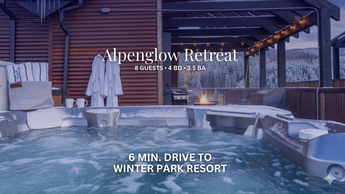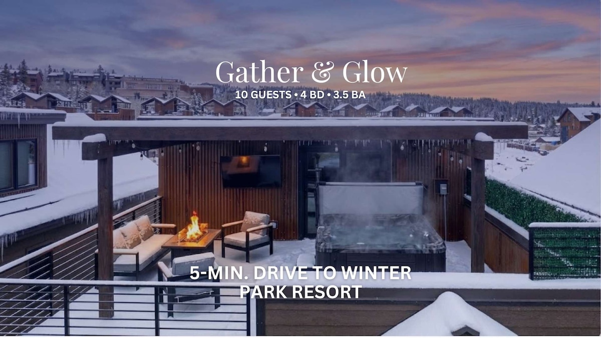Escápate a Gather & Glow, una casa adosada de lujo en el centro de Winter Park con vistas a la montaña, una bañera de hidromasaje privada en la azotea y una sala de juegos. Camina a tiendas, restaurantes y el servicio de traslado gratuito a Winter Park Resort. Las características incluyen 4 dormitorios (capacidad para 10 personas), una cocina de chef, sonido Sonos, cargador de vehículos eléctricos, calentadores de botas y mucho más. Perfecto para familias, grupos o cualquier persona que busque comodidad, estilo y aventura, justo en el corazón de todo.