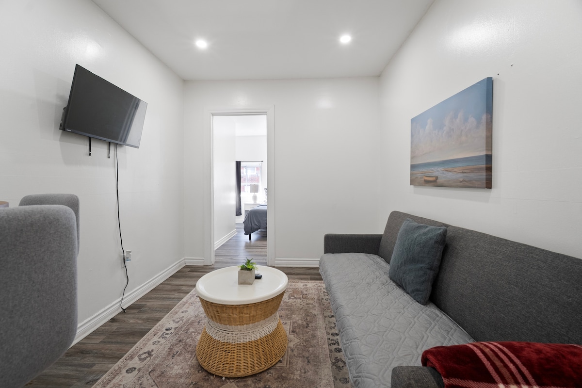 Disfruta de tu experiencia en este céntrico y encantador apartamento de un dormitorio en una casa histórica del siglo. Esta unidad, reformada con buen gusto, es espaciosa, está equipada con una cocina completa y cuenta con un espacio de trabajo dedicado en el dormitorio grande. Cuenta con internet de alta velocidad ilimitado, televisión inteligente y entrada segura sin llave. Aparcamiento disponible en la parte trasera para 1 vehículo. El dormitorio cuenta con una cómoda cama tamaño king, espacio de trabajo dedicado y cortinas oscuras.