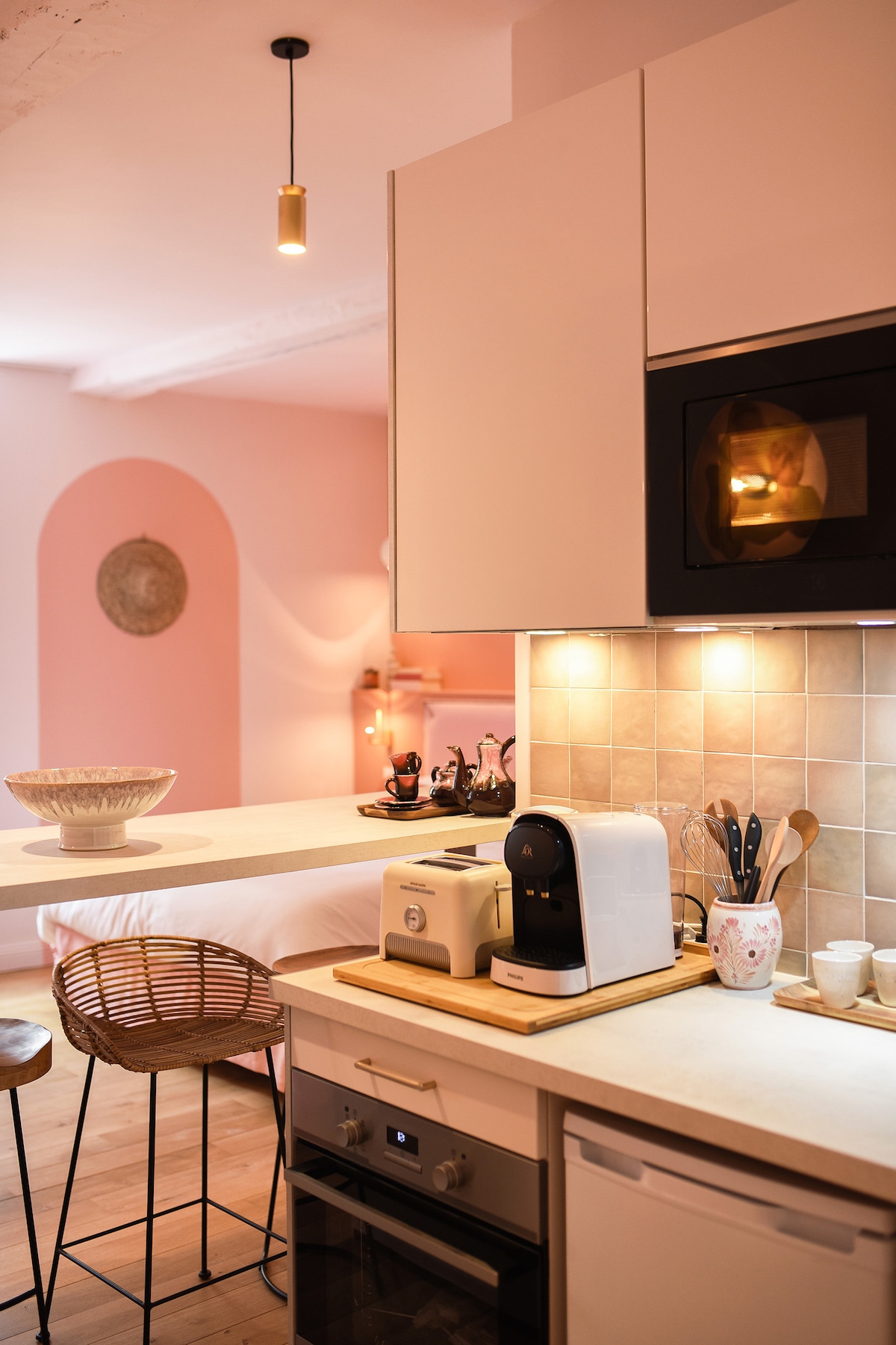 ¡Disfruta del eterno verano en el suelo de madera clara! En el primer piso de la Cité Solidor, alójese en este amplio estudio de 30 m² con tonos rosas y pasteles. ¡Definitivamente la pequeña pepita de la ciudad! Situado en un lugar privilegiado (la Ciudad de Aleth), te alojarás a pocos pasos de la playa de Solidor y la de los Sablons bajos, todo ello a tan solo 15 minutos a pie desde los intramuros.