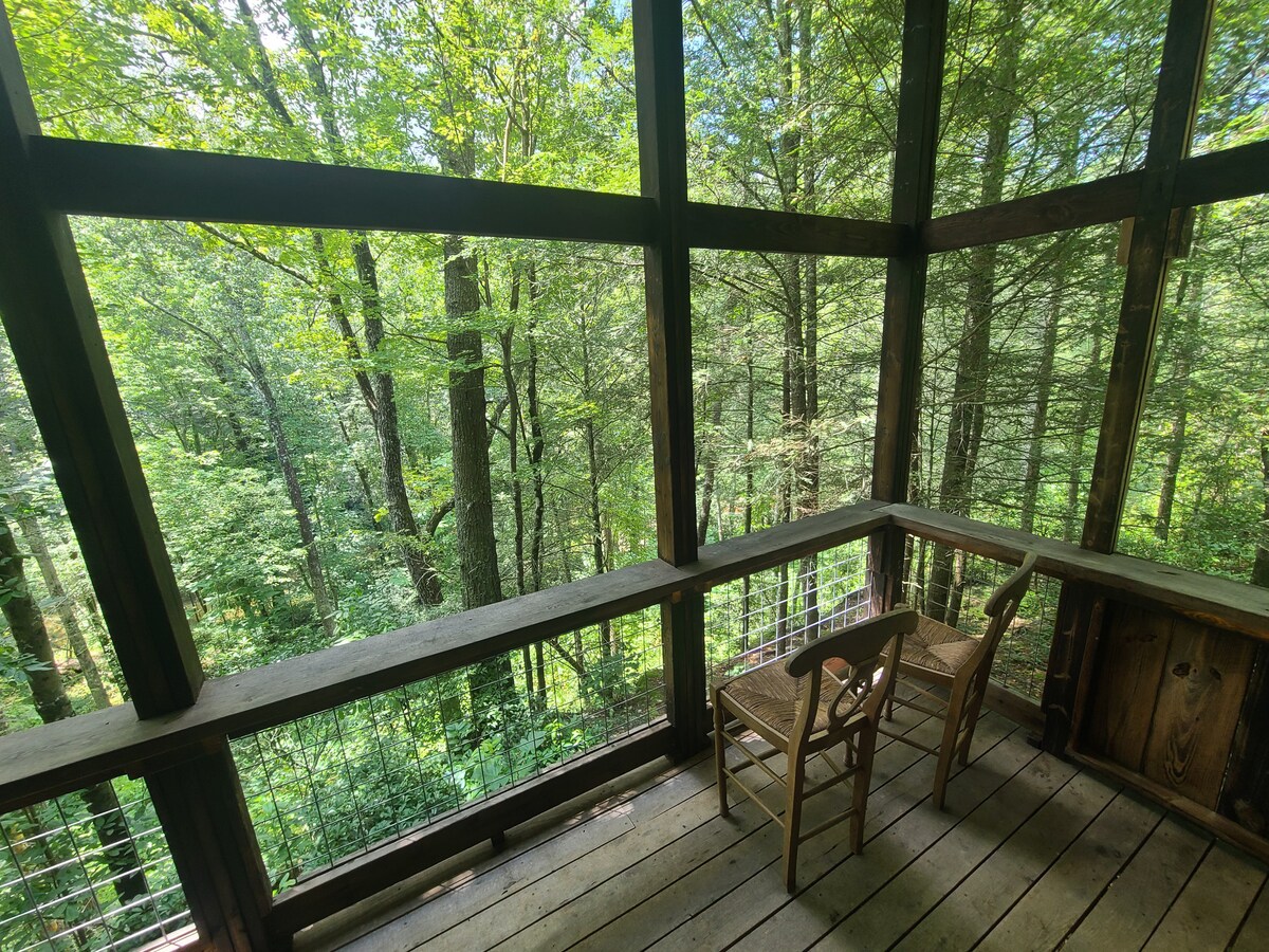 Esta es una casa del árbol única de nueva construcción (‘23) en 10 acres boscosos cerca del lago Watts Bar. ¡Cerca de puertos deportivos, restaurantes, senderismo, cascadas y a poca distancia en auto de rafting en aguas bravas y Gatlinburg! ¡Disfruta de la paz y la tranquilidad de tu terraza privada con vistas a un pequeño bosque Holly, un bosque exuberante y un arroyo de temporada! Fogata con sala de estar, cocina al aire libre y barbacoa. Cómodo espacio arriba con cama tamaño queen de espuma viscoelástica, sofá de dos plazas futón, baño completo, chimenea y minicocina. Kayaks de temporada. ¡No se admiten mascotas ni niños menores de 12 años!