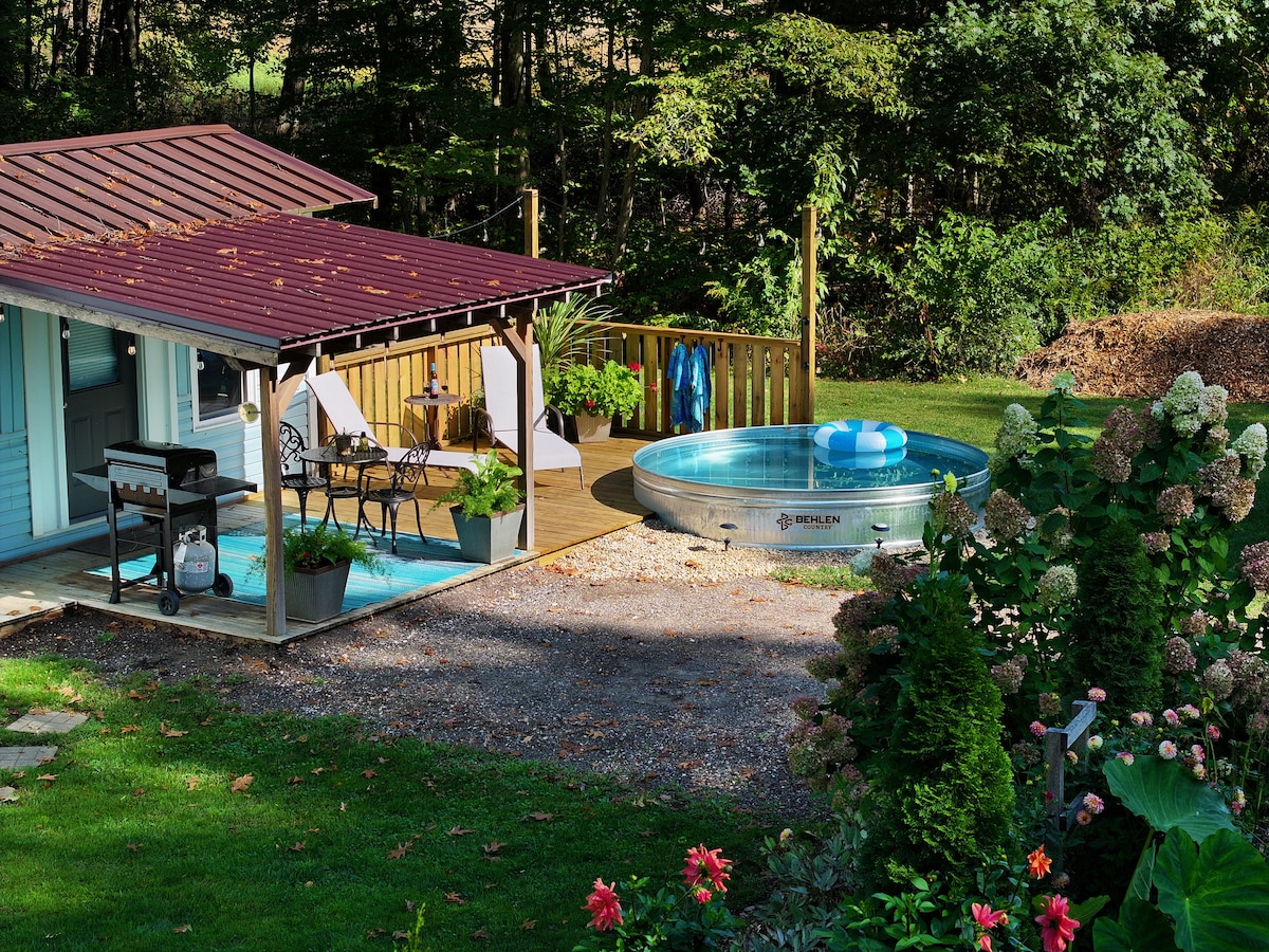 Escápate a este bungalow privado y renovado para dos, enclavado en la naturaleza. Perfecto para un retiro tranquilo, cuenta con un espacio de trabajo dedicado, conexión Wi-Fi rápida, una cocina pequeña bien equipada y una piscina de tanque de stock de temporada. Disfruta de senderos privados en una granja pintoresca, pero a solo 45 minutos de Notre Dame, Shipshewana y las playas del lago Michigan. Te espera una escapada encantadora y tranquila.