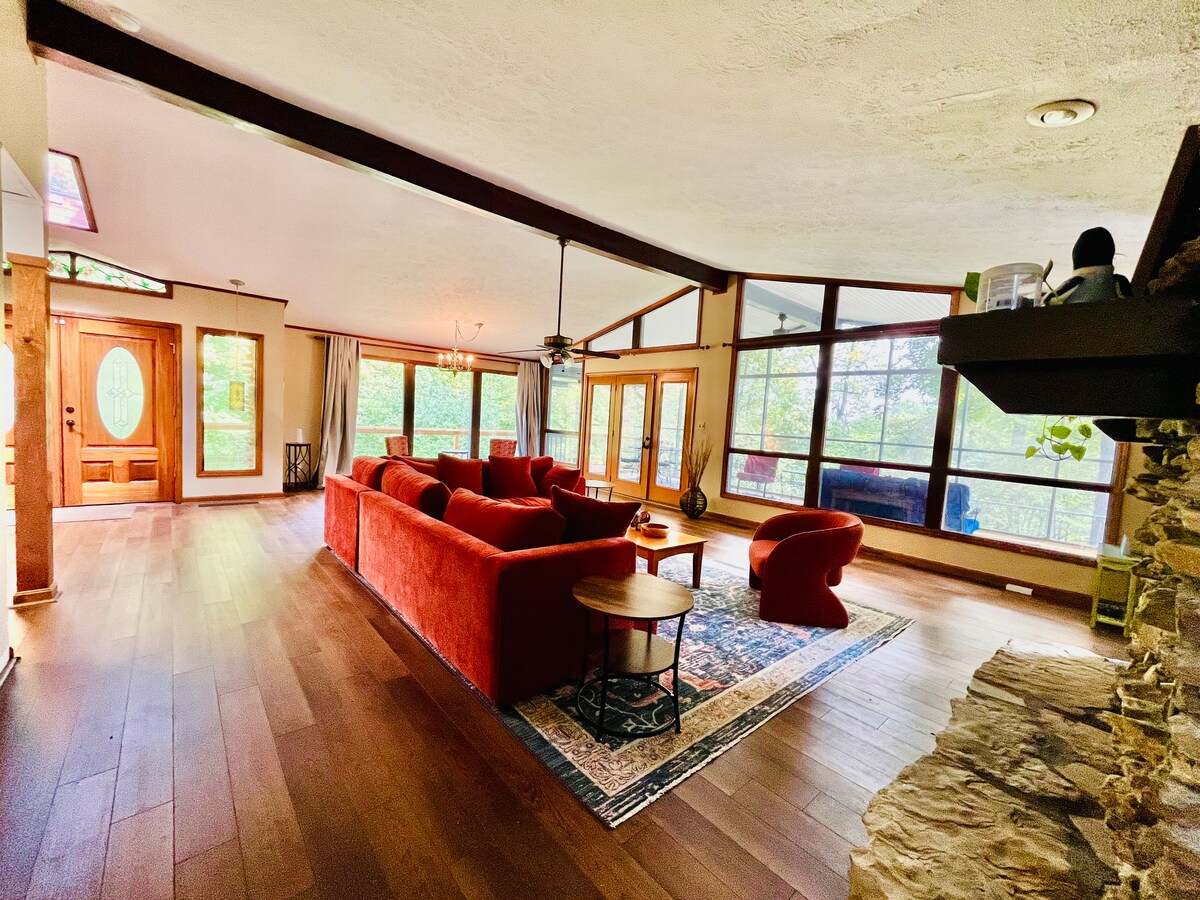 Acogedor refugio para unas vacaciones familiares perfectas. Tranquila y aislada en una carretera semiprivada, esta casa de piedra de mediados de siglo de 2700 pies cuadrados en un lote frente al mar de 1 acre con 4 camas y 3,5 baños que duermen 11 cómodamente. Un entorno natural similar a un parque con vistas al agua desde una enorme terraza y porche de pantalla, con fogata también. A menos de 5 minutos del Parque Nacional Rough River Dam y la rampa para botes donde puedes salir para tu viaje de pesca o relajarte junto al lago y descansar. Cerca de tiendas y restaurantes.