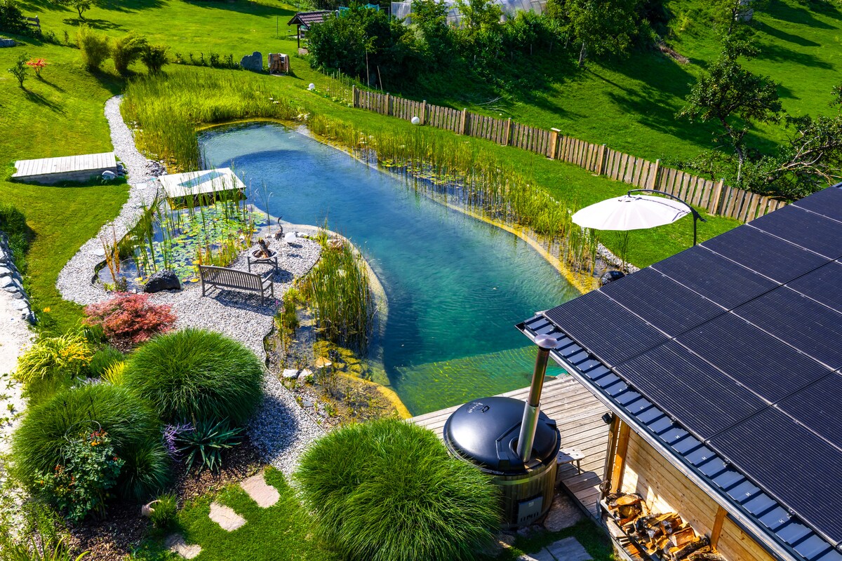 Nuestro apartamento de 2 dormitorios con 1 baño, cocina, sala de estar espaciosa con sofá y mesa de comedor, aire acondicionado y patio espacioso se encuentra a solo 100 metros del lago Bled (zona de natación). Está ubicado en una zona muy tranquila. Tiene su propia entrada y se encuentra en nuestra casa (así que siempre estamos cerca para ayudarte). Somos una familia de 5 personas y estaremos encantados de recibirte. Sostenibilidad: Producimos más energía de la que usamos. No se incluye el impuesto turístico (3,13 euros para adultos por día, 1,56 euros para niños mayores de 7 años).