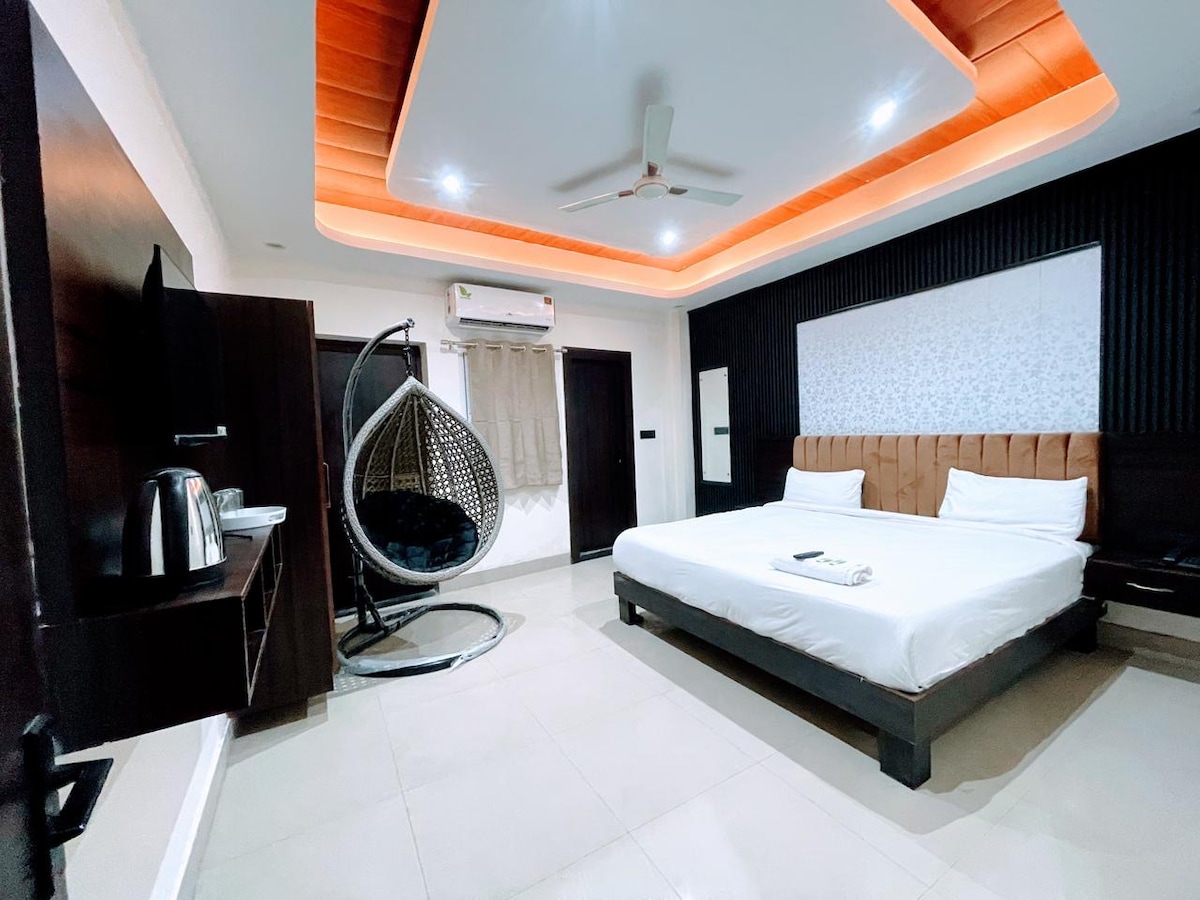 Descubre una suite de lujo en la azotea en el corazón de Gurgaon, a pocos minutos de la estación de metro HUDA City Centre. Esta elegante habitación con terraza ofrece una combinación de comodidad, privacidad y diseño moderno, perfecta para parejas o viajeros de negocios. Sal a tu terraza privada con asientos al aire libre, el lugar perfecto para el café de la mañana o la relajación de la noche. Relájate en el jacuzzi bajo el cielo abierto, que ofrece una experiencia tranquila y romántica. Ubicado en el quinto piso (acceso al ascensor hasta el cuarto
