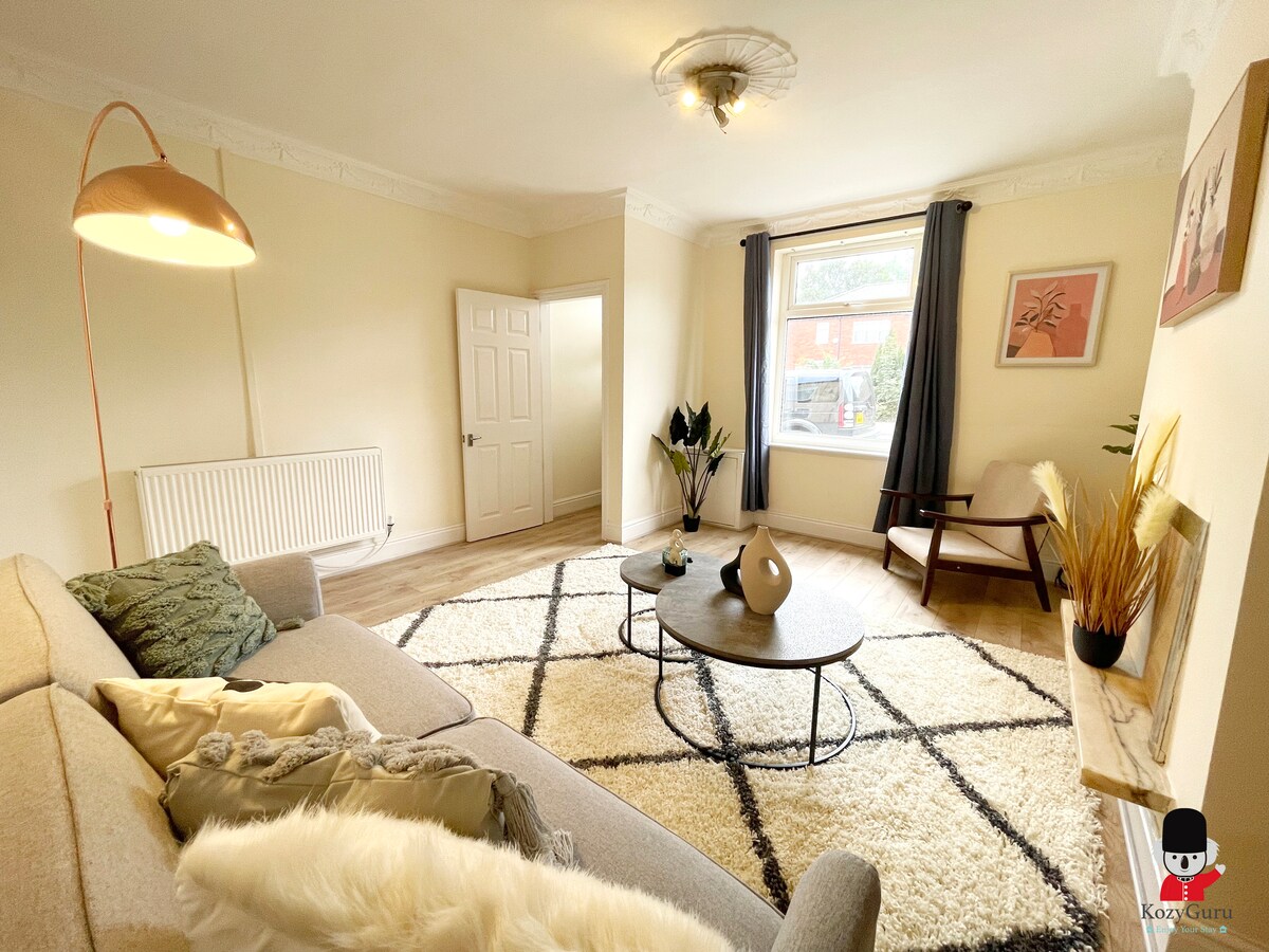 KozyGuru | 3 dormitorios, 5 camas | Encantador hogar dulce | Swinton Manchester | Ubicación conveniente