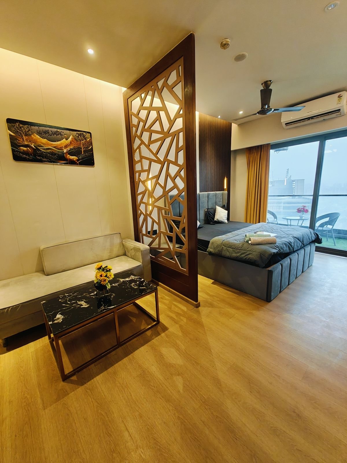 Raahat by Mulberry Homestays es un apartamento de élite, totalmente amueblado, ubicado en Sunworld Grand Arista, Noida. Diseñado para aquellos con un gusto por el lujo, cuenta con un jacuzzi privado de dos plazas, iluminación con sensor, aire acondicionado Mitsubishi, televisores inteligentes e interiores que redefinen la elegancia. Ya sea una escapada romántica o unas vacaciones de primera calidad, Raahat ofrece la mejor combinación de comodidad y opulencia, lo que la convierte en una de las estancias más impresionantes que Noida tiene para ofrecer.