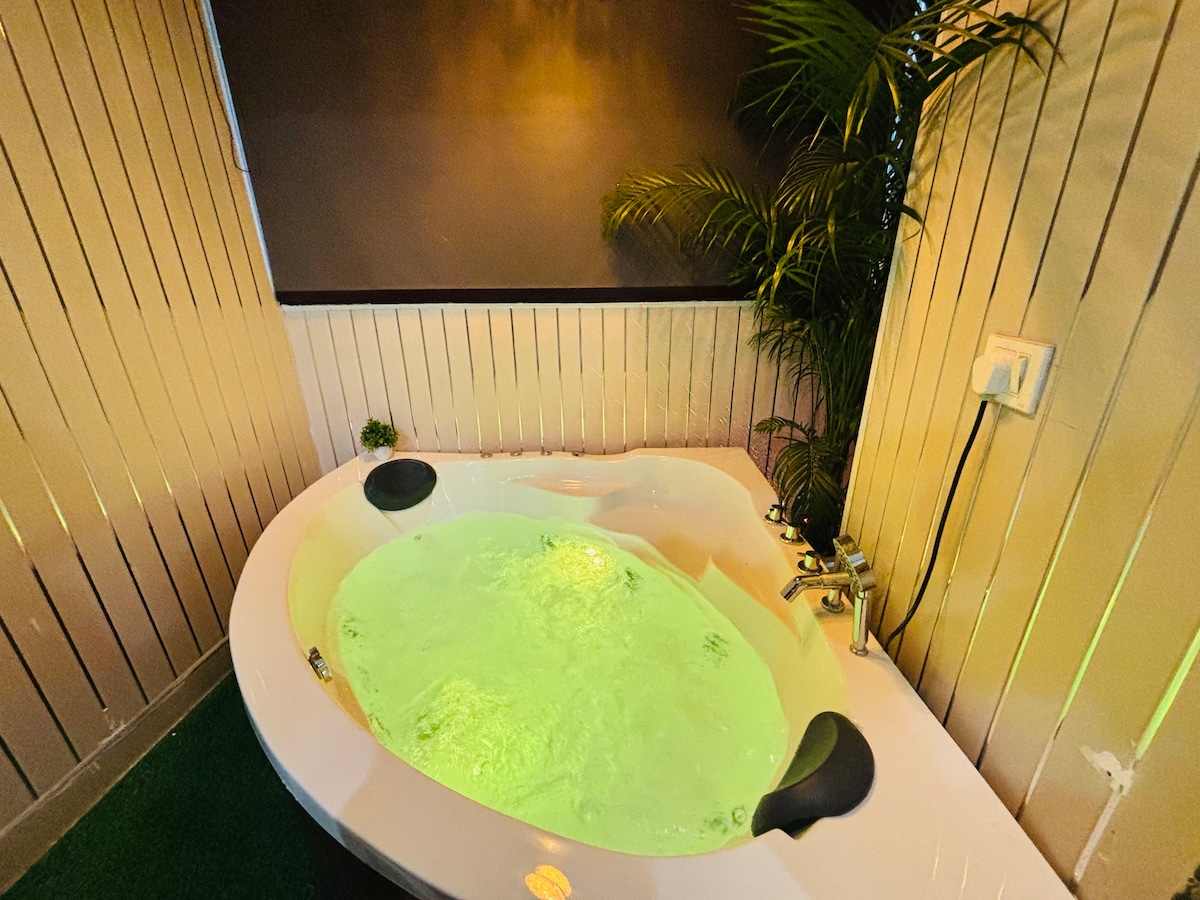A Golf, Lake, sunrise & pool facing entire luxury apartment-Fully Furnished with Hottub, ACs, Heater, Airpurifier, Laundry, Fridge, LED, WiFi, Toiletries, Lift, fully functional Kitchen Oven, gasstove , RO, Utensils etc, Extra bed- Experience a mesmerizing stay in the nature at its best! This is 2 BHK beautiful apartment for homestay but Only 1 BHK (entire place) will be given. 2nd smaller room is locked. Breakfast - NA. Couple Friendly, Perfect for get together & day party! Cheers!
