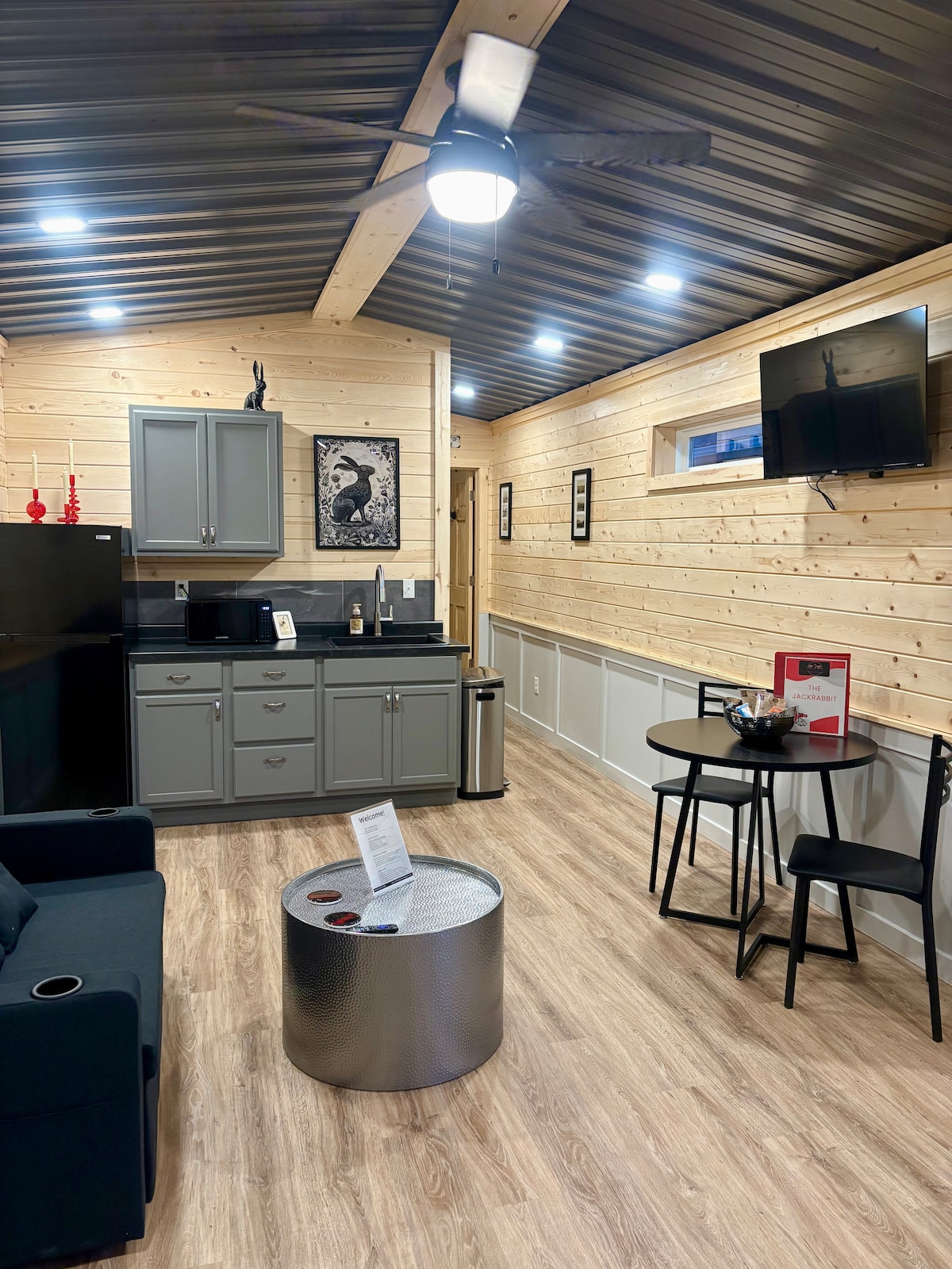 The Cabin is a cozy, mountain-themed tiny home set on the Western Frontier of Kansas. Inside are pine tongue-and-groove walls, aged galvanized roof panels, and rustic details which create the feel of a compact mountain lodge. Thoughtfully designed with layered textures and handcrafted touches, it features a small but well-equipped kitchenette. Ideal for couples or solo travelers, The Cabin offers a peaceful, comfortable retreat near open trails and historic towns.