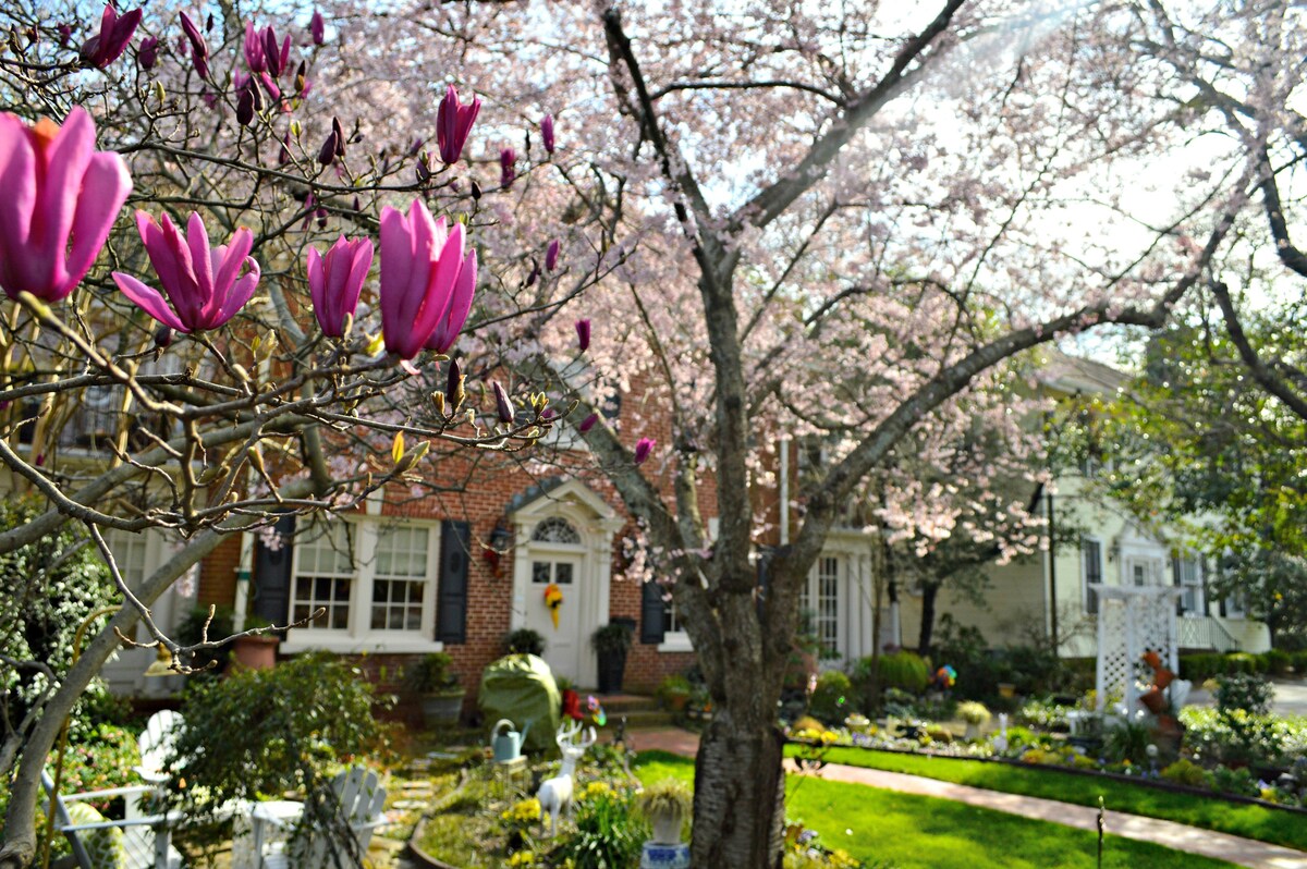 Ubicado en el corazón del centro de Greenville, Carolina del Sur, Pettigru Place Bed & Breakfast está rodeado por las elegantes casas del distrito histórico de Pettigru. Disfrute de la hospitalidad sureña en su máxima expresión a poca distancia a pie de la calle principal de Greenville. Este retiro histórico cuenta con habitaciones comunes bellamente decoradas, seis lujosas habitaciones con baños privados y un floreciente jardín inglés que proporciona un acogedor refugio a pocos pasos de nuestra encantadora calle principal en Greenville. Más que el típico alojamiento de hotel, la posada inmediatamente te hará sentir como en tu propia casa mientras el posadero te recibe con una sonrisa. La galardonada calle principal de Greenville está a 800 metros del distrito histórico de Pettigru desde el bed and breakfast. Falls Park en el río Reedy, con el Liberty Bridge y cascadas se encuentra a pocos pasos de Main Street. Disfrute de las ofertas únicas y eclécticas de Mast General Store, eche un vistazo a las últimas tendencias en Augusta Twenty o saboree algo dulce de Kilwins Chocolate Shop o The Cream Shack. Cuando esté listo para un descanso de las compras, pase por Spill the Beans y pruebe uno de sus deliciosos sabores de helado. Alquile bicicletas por el día para experimentar el camino del conejo del pantano con acceso a través de Cleveland Park a sólo 1/4 de milla de la posada o en varios puntos del centro. La hermosa y arbolada zona de Main Street cuenta con tiendas, restaurantes y varios lugares de artes escénicas, incluido el Bon Secours Wellness Arena, a solo una cuadra de la posada. El centro también cuenta con varias galerías y museos. Permita que nuestra posada sea su refugio a medida que explora Greenville de la comodidad inigualable y la gracia de una verdadera cama sureña y desayuno. Cuando terminen las actividades de su día, regrese a la posada para una copa de vino y un plato de queso y galletas mientras se relaja en el jardín en las sillas Adirondack, en una de nuestras áreas comunes o en su propia habitación hermosa. Cada mañana, despierte con el aroma tentador de un desayuno gourmet completo como duraznos y crema de tostadas francesas. Dos trozos de pan francés rallado a dorado y cubierto con duraznos SC frescos y una salsa francesa de caramelo de vainilla servida con tocino crujiente o, deléitese con huevos de albahaca, un croissant tostado con tomates en rodajas, jamón y huevos revueltos cubiertos con una salsa de crema de albahaca y parmesano. ¡Te prometemos que no te irás con hambre! Si buscas aventuras al aire libre, Greenville es la puerta de entrada a Blue Ridge Parkway y el área del estado de Carolina del Sur incluye algunas de las áreas más hermosas del estado para descansar y recrearse. Encontrarás rutas de senderismo y ciclismo, béisbol de ligas menores y golf a menos de 15 minutos de la casa. Permítanos darle instrucciones para llegar a una de las 20 cascadas de la zona. O visite un parque estatal y observe las águilas volar debajo de usted. Visite una de las granjas de la zona, como Happy Cow Creamery, para hacer un recorrido (y pregúnteles por qué sus vacas son más felices) o pase por una de nuestras microcervecerías locales, Yee Haw Brewing Company o Fire Forge Brewery, y pruebe una de sus pequeñas creaciones por lotes. Estamos a pocos minutos de las universidades de Furman y Bob Jones, así como a 48 kilómetros de la Universidad de Clemson. Pettigru Place Bed & Breakfast es el lugar perfecto para comenzar su aventura en Carolina del Sur, y esperamos darle la bienvenida a Greenville!