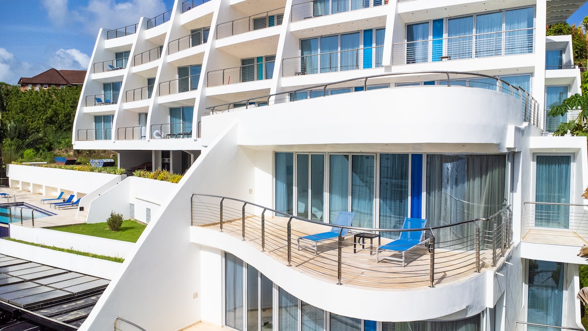 Un dormitorio, dos baños completos y una terraza con vistas a la bahía y al océano más allá. Un pequeño departamento encantador en el opulento distrito privado Lance Aux Epines, con una cocina totalmente equipada y situado en un edificio seguro. Contamos con una playa privada, un bar y restaurante Tiki, una carnicería y delicatessen franceses, seguridad las 24 horas y servicio de limpieza dos veces por semana.
