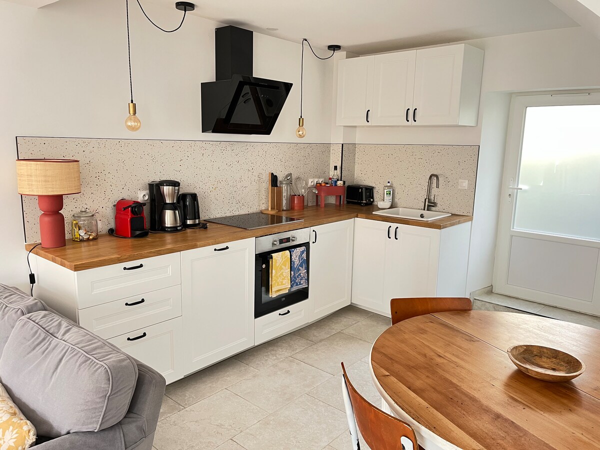 Authentic village house in the center of Larchant in the heart of the Fontainebleau forest. Our house, nicely renovated in 2019, consists of 3 rooms, a spacious kitchen, a bathroom / WC and a terrace with a small garden. It is located in a very quiet courtyard. It enjoys beautiful light in summer and winter. Ideal for a family stay. - on the ground floor: living / dining room (convertible daily comfort), kitchen with dining area - on the 1st floor: 2 bedrooms and bathroom / WC