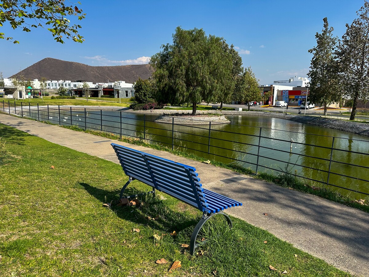 Casa con jardín y acceso a Alberca, Lago, Juegos Infantiles y Dog Park. Disfruta la alberca, la pista para correr, juega pádel o aprovecha el coworking junto al lago para trabajar. Justo enseguida de López Mateos / carretera a Morelia. Cerca de Galerías Santa Anita, Plazas Outlet, Flex, PiSa, Punto Sur, ABB. Elige estadía x noche o x mes. Facturamos. Dentro de una privada con seguridad 24/7. ¡Quédate en un lugar tranquilo, cómodo y rodeado de bellos paisajes!