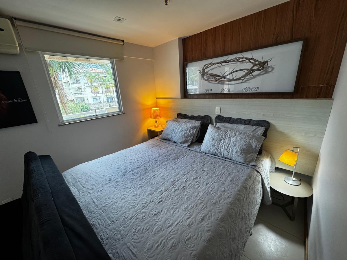 Hermosa suite , balcón gourmet, vistas a la playa de Barra da Tijuca, Pedra da Gávea y Canal da Barra. Pequeño balcón con encimera de lavavajillas, equipado para comidas rápidas y prácticas con microondas, freidora de aire, sándwichera, cafetera, tostadora , minibar, cubiertos, platos, vasos y pequeñas ollas de microondas. LA ATENCIÓN NO TIENE ESTUFA NI SARTENES. Habitación cómoda con mesa y 2 sillas, cama doble, armario y aire acondicionado. Baño con ducha de agua fría y caliente.