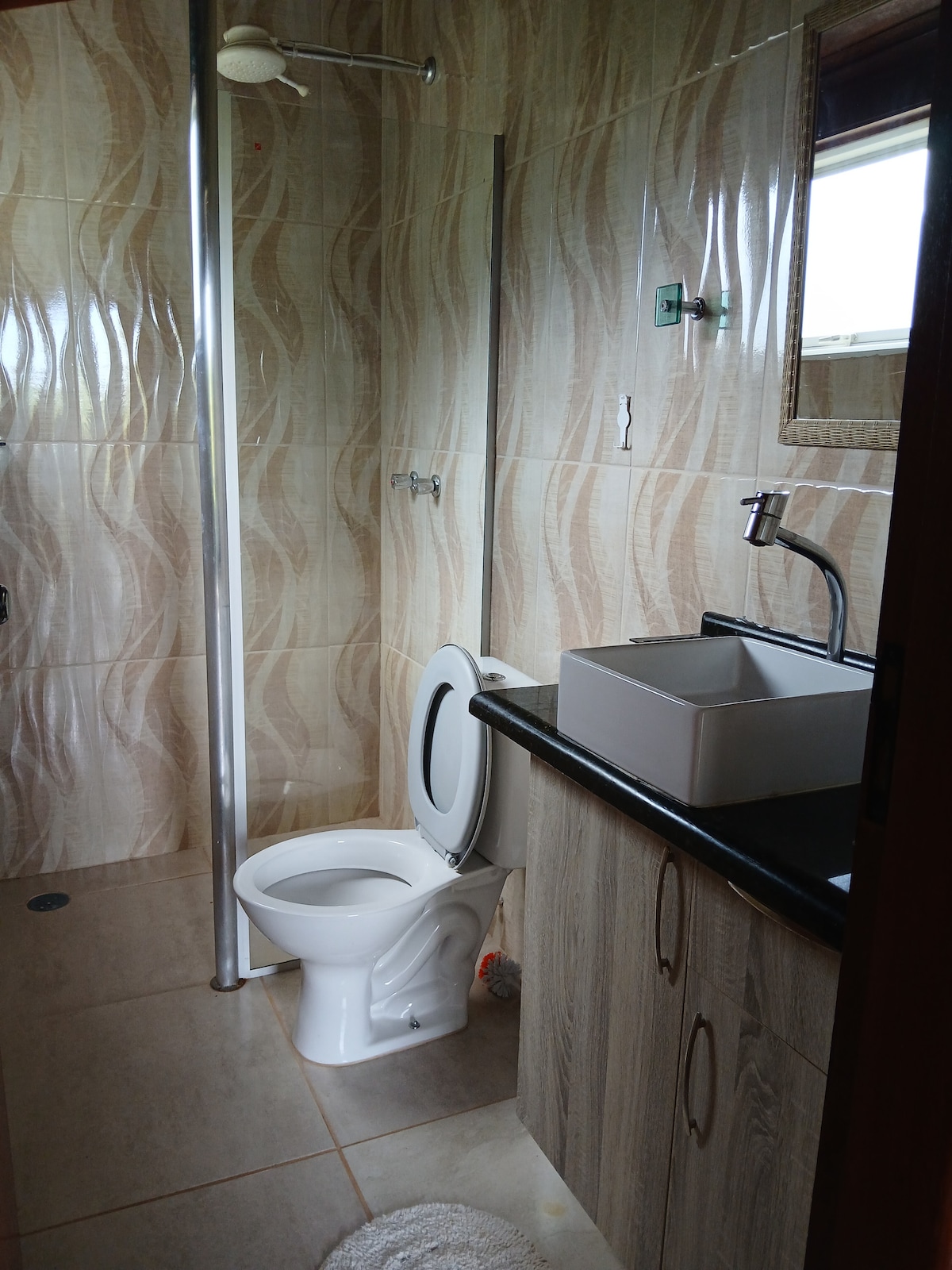 A suíte é ideal para momentos em família, equipada com uma cama de casal e uma cama de solteiro. O quarto é completo, com ventilador, banheiro privativo, roupa de cama, kit de higiene, toalhas de banho, frigobar e guarda-roupa, proporcionando conforto e praticidade para sua estadia.