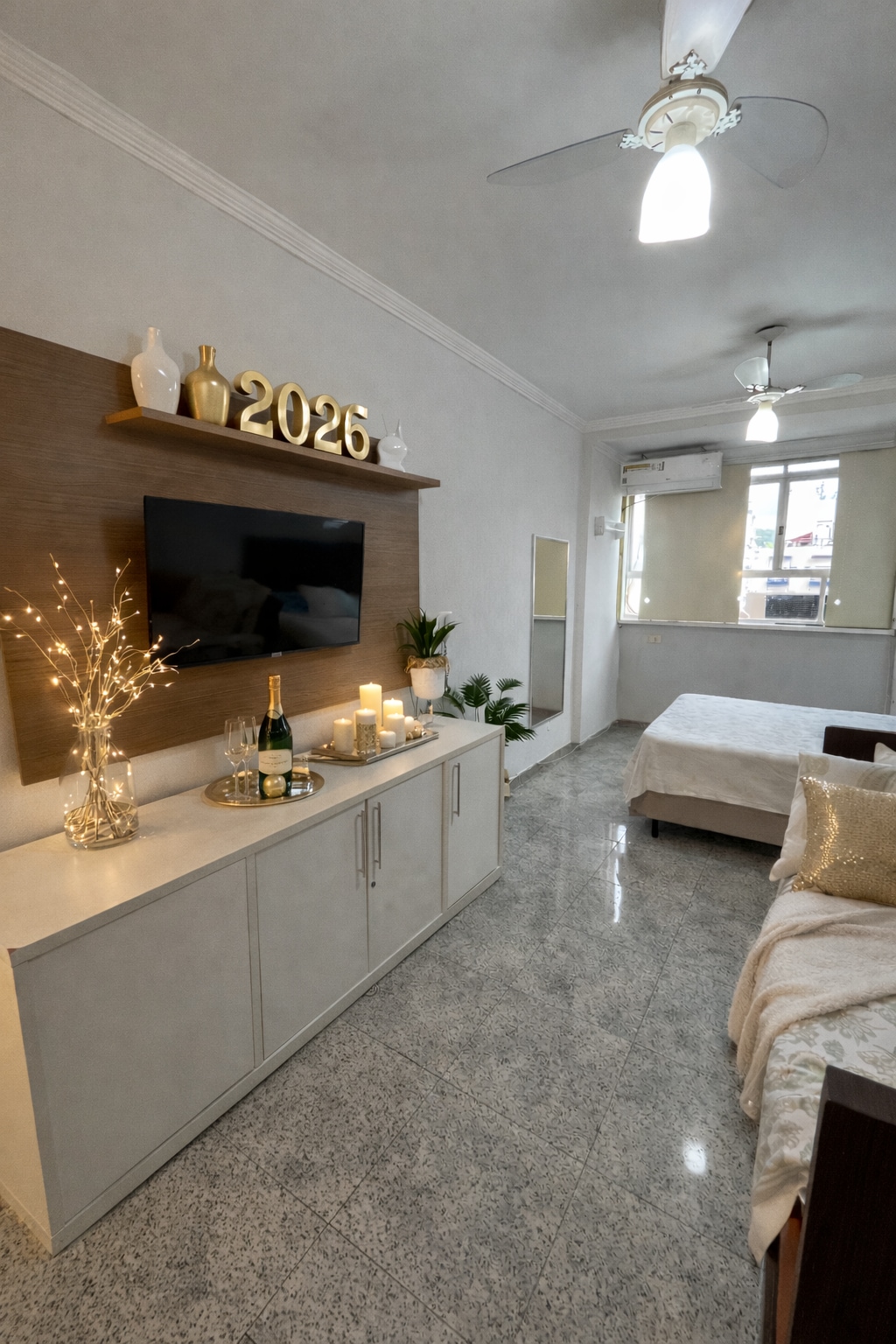 1 dormitorio, ar na sala e quarto, TV em todos ambientes a cabo e Wi-Fi, maq de lava e seca,sofá cama na sala.piscina churrasqueira,sauna,academia e serviço de praia a 25 metros da praia.servico de limpeza e vista pro mar.