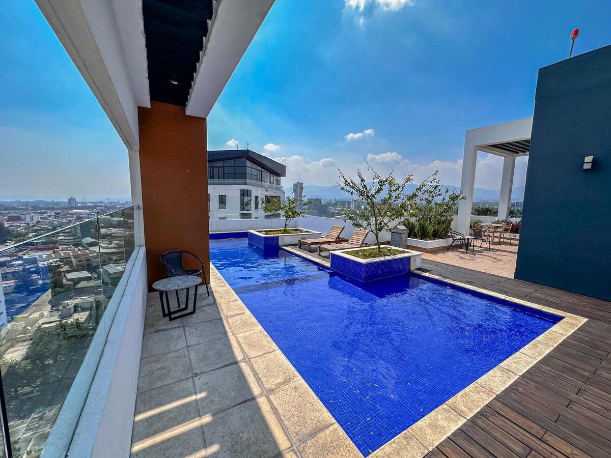 Apartamento modificado de 2 a 1 habitación para ofrecer grandes ambientes y una vista estupenda a la ciudad y los volcanes. Sus más de 85 m2 se conjugan con un equipamiento y decoración de primer nivel. Contamos con piscina climatizada a 31 C, gimnasio equipado, areas sociales en el piso 25 como un Fire Pit; asi como supermercado, salon de belleza y banco en el lobby. Ubicado en la zona hotelera de la ciudad o Zona Viva a pasos de los mejores hospitales, restaurantes y centro comerciales