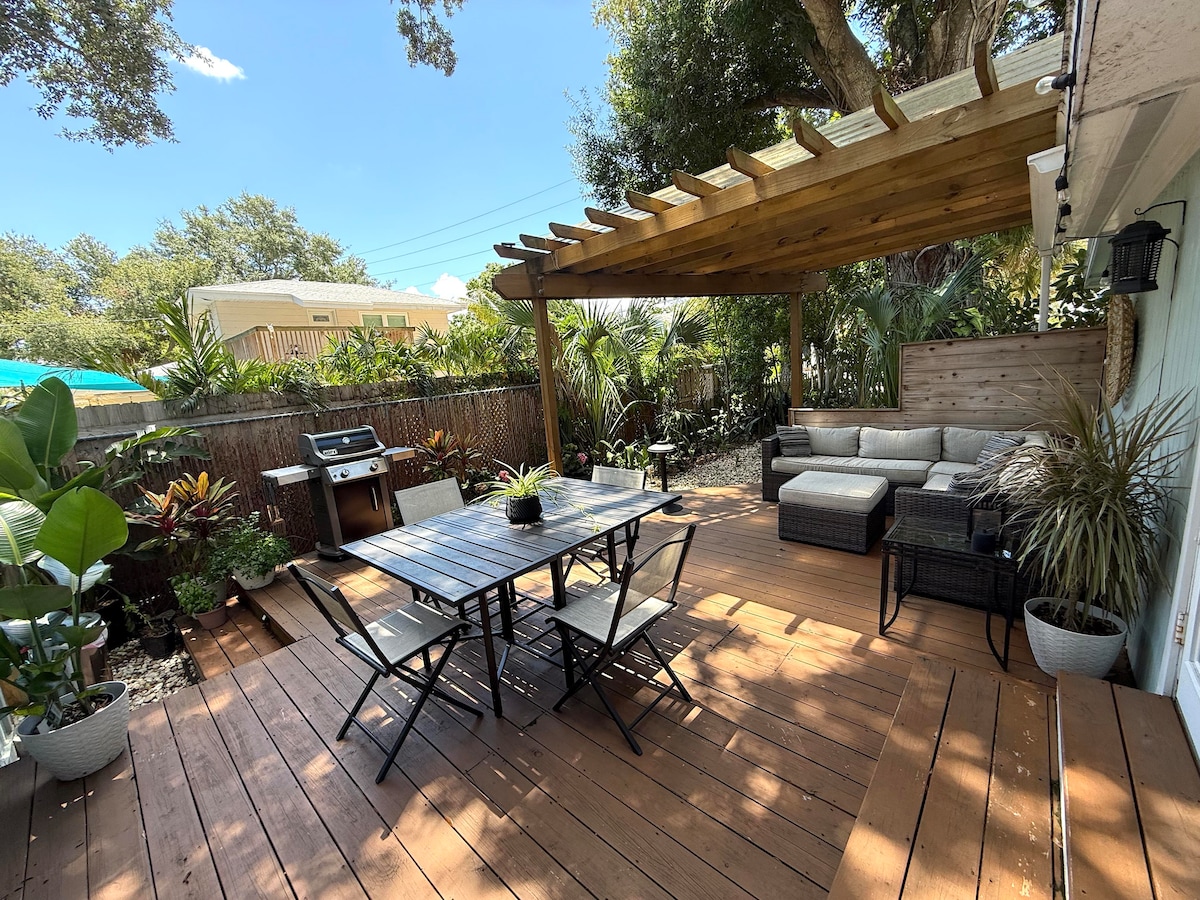 Bienvenido al refugio náutico de The Driftwood. Esta acogedora casa de 2 dormitorios es un refugio de estilo marítimo, que ofrece una escapada única y refrescante para tu estancia. Relájate en tu patio privado con una fogata o cena en el comedor al aire libre. ¿Tienes a tu mascota alojada contigo? ¡Aquí son bienvenidas! Este hermoso y diverso barrio está a una milla del bulevar de playa de Gulfport, donde puedes ir de compras, cenar o pasear por la playa. A 6 millas de distancia se encuentra la famosa playa de St Pete o el muelle de St Pete.