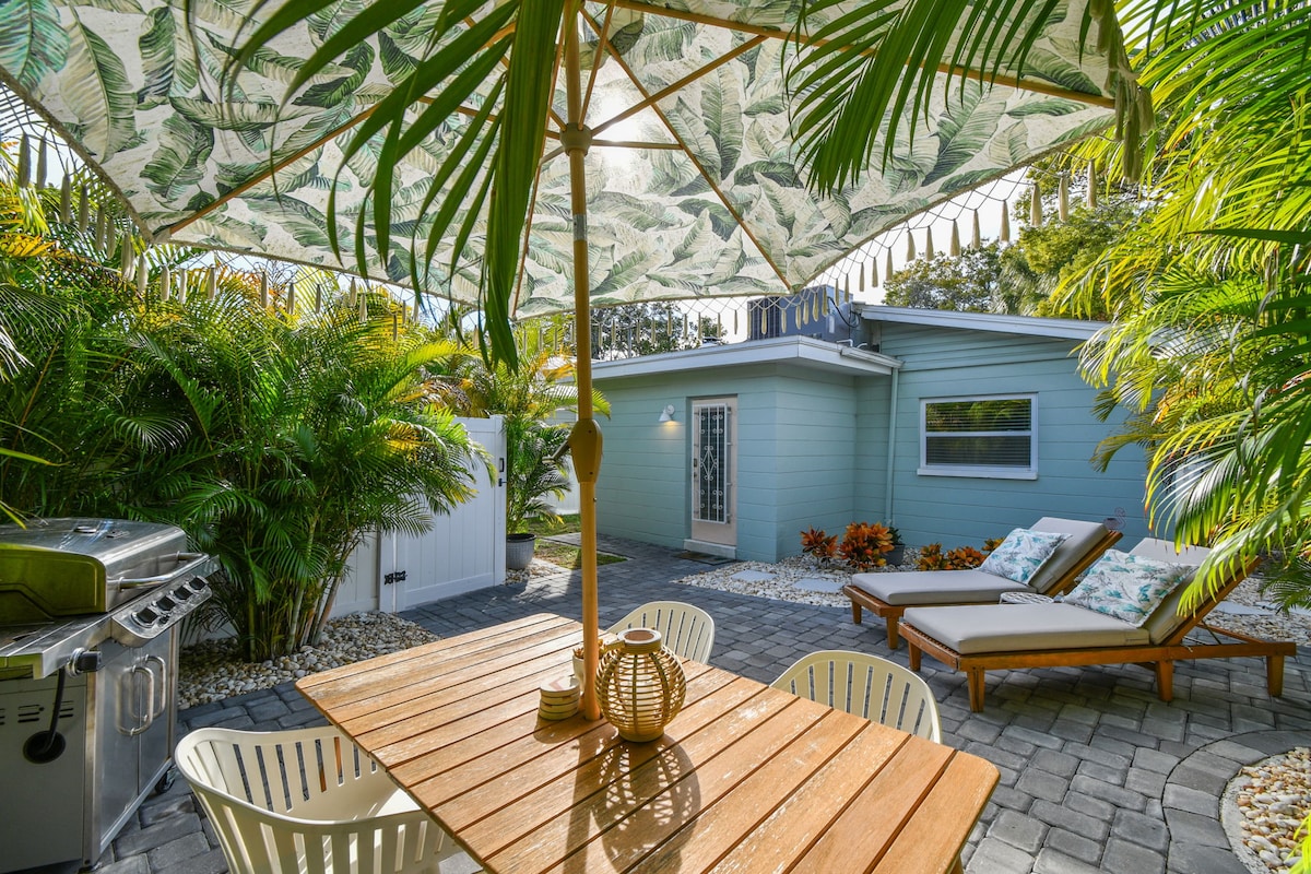 Relax, reconnect and revitalize in this private, intimate cottage that has everything you need to leave the hustle and bustle behind. Surrounded by lush tropical vegetation in the shade of giant live oaks and located in the Gulfport Arts District, you're a short walk or bike ride from excellent urban parks, restaurants, live music, fashion and art boutiques, dancing at the Gulfport Casino, community theater, and a beautiful beach that looks out over sailboats moored in Boca Ciega Bay.