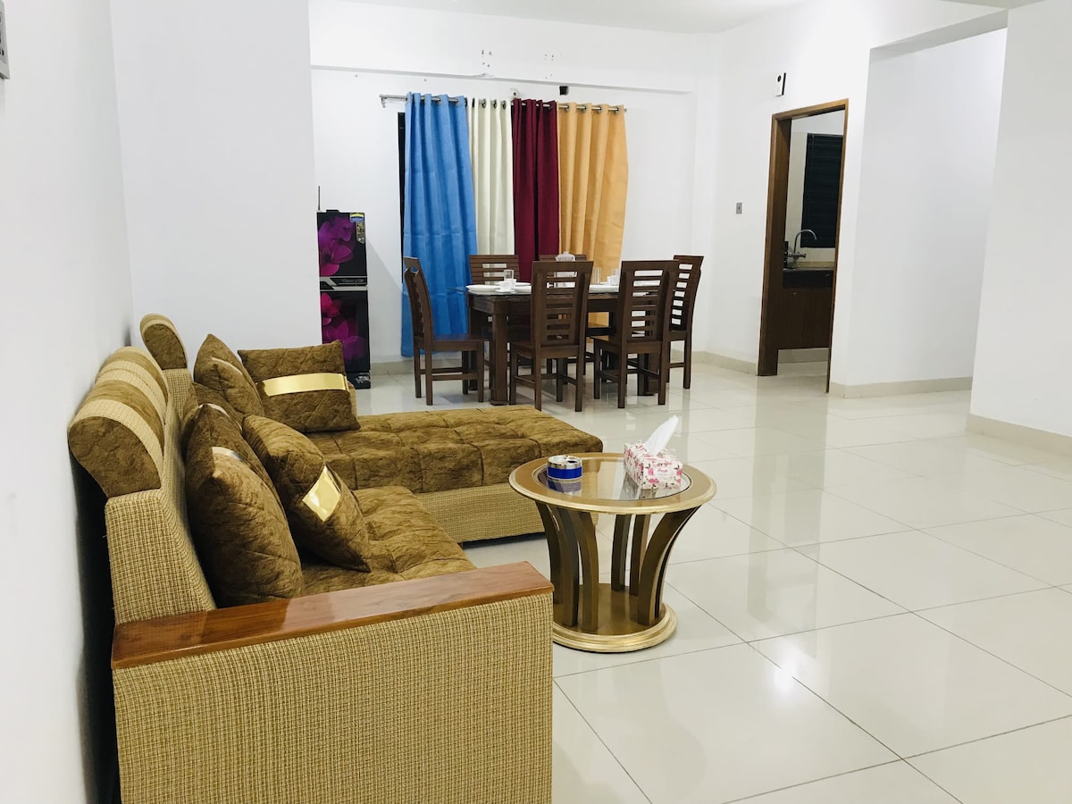 ¡Te damos la bienvenida a tu retiro sereno en Banani, Daca! A solo 1 minuto a pie del Hotel Sheraton y la Mezquita Central, el supermercado Banani, nuestro apartamento totalmente amueblado tiene capacidad para seis huéspedes. Disfruta de tres dormitorios acogedores, una cocina moderna, un comedor y una sala de estar relajante. Sal a tu balcón privado para tomar aire fresco o utiliza el mini espacio de trabajo para la productividad. También Gulshan y Baridhara están muy cerca de nuestro departamento. ¡Reserva tu estancia hoy mismo y disfruta de una escapada encantadora en Banani!