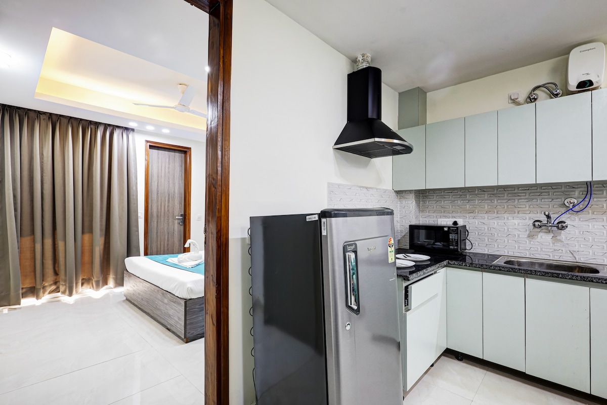 Apartamento de servicio premium 1BHK en el sector 43, Gurgaon con aire acondicionado en la sala de estar y el dormitorio, además de una cocina pequeña con inducción, microondas y cubiertos. En una zona elegante, a poca distancia del centro comercial Gold Souk y la escuela Shalom Hills, a 2,2 km del metro Millennium City Centre y a 2,1 km del hospital Fortis. Los huéspedes extranjeros son bienvenidos. El check-in anticipado estará sujeto a disponibilidad y se cobrarán 500 rupias, así como el check-out después de la hora establecida, también será el mismo con 500 rupias adicionales por cada 3 horas a partir de entonces.