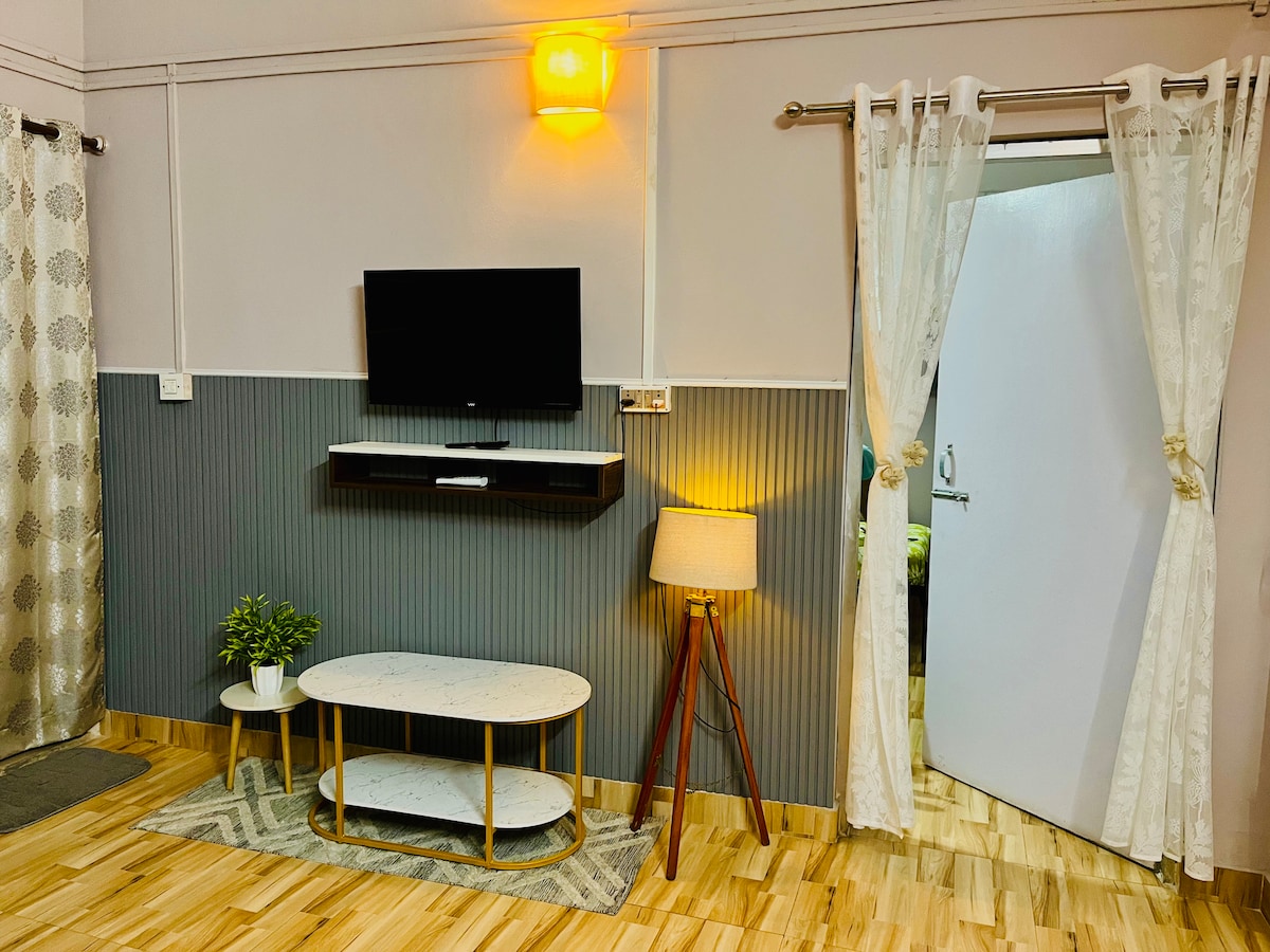 A peaceful, cozy & stylish homestay with a spacious bedroom, a hall cum kitchen, & an attached bathroom for family, couple or a group of 4-5 people. The stay comes with all the modern amenities like TV, WiFi, Geyser for a perfect homely stay; be it a private short or a longer holiday stay. The kitchen is well equipped to cook meals (15 min doorway online food delivery is also available). Located near the highway makes it an easy hassle-free entry and exit avoiding the city's tiresome traffic..