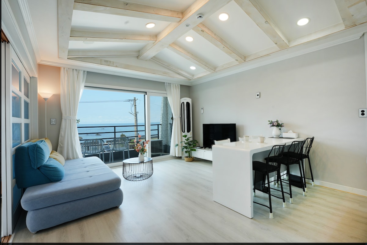 Hola. Queremos crear un espacio que te haga olvidar la congestión del centro de la ciudad con el sonido de las olas del mar. Nuestro espacio, que se encuentra a 20 minutos del aeropuerto, ofrece vistas al mar azul de Jeju desde todas las habitaciones. Composición del espacio Espacio de 12 pyeong de 3 pisos de altura (con ascensor) 1. Espacio de dormitorio : La habitación es un espacio tipo estudio con cocina. Cama, TV de pared, mesa de té y mesa para dos, perchero, soporte, fregadero, aire acondicionado, frigorífico pequeño (congelador separado), inducción 2. Cocina : Platos y utensilios de cocina para 2 personas 3. Baño : Ducha de girasol, toallas, champú, acondicionador, gel de baño, jabón, papel higiénico (por favor, tenga en cuenta que no es posible proporcionar cepillos de dientes debido a la Ley de Control de Higiene). 4. Terraza 5. Zona de barbacoa Ocean barbacoa conectada al mar: 20 000 wones (proporcionamos carbón y parrilla). Al lado del vestíbulo, hay un área de barbacoa separada en caso de lluvia. 6. Estacionamiento: Estacionamiento eléctrico disponible. 7. Solicite por separado la lavandería y la secadora en la entrada del primer piso. Gracias.