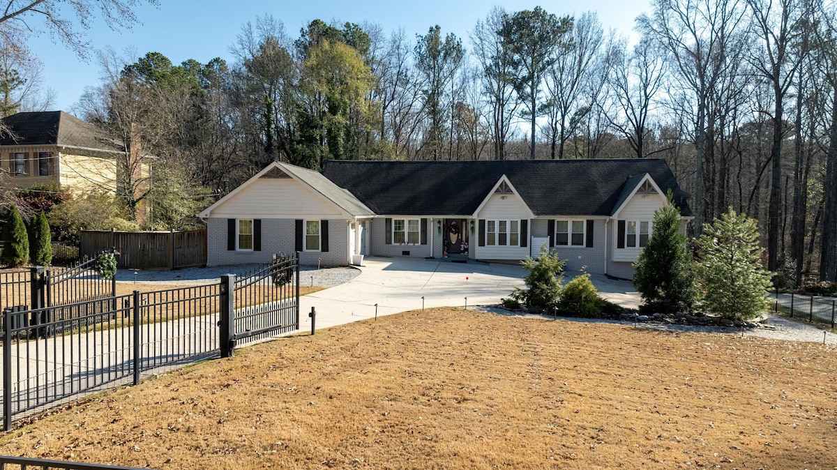 ¡Experimenta la tranquilidad en este rancho de estilo cabaña terapéutica! Cada dormitorio cuenta con un televisor de alta definición, mientras que la sala de estar cuenta con un Samsung de 4k de 65 pulgadas. Disfruta del patio trasero vallado, apto para mascotas con una tarifa de $100 por mascota. A solo 2 minutos de Kroger/316, a 4 minutos de Publix/85 y a 6-7 minutos del centro comercial de GA. El centro de Lawrenceville está a 3 minutos en auto. Barrio seguro junto a Buford Dr. 20. Wifi a nivel empresarial, toneladas de naturaleza... Despiértate con los pájaros que te saludan con sus canciones.