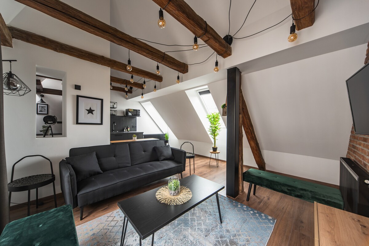 Este lujoso apartamento en el corazón de Győr se encuentra en un edificio completamente renovado que consta de 15 unidades de alquiler, cada una de ellas única con su propio diseño único. Este se inspiró en los apartamentos tipo loft de techos altos, lo que se refleja en los materiales, colores y patrones utilizados. Tanto si vienes a explorar la ciudad como si solo estás de paso, este alojamiento cerca de la plaza principal y el Danubio es la opción perfecta y cuenta con todos los servicios que puedas necesitar para una estancia corta.