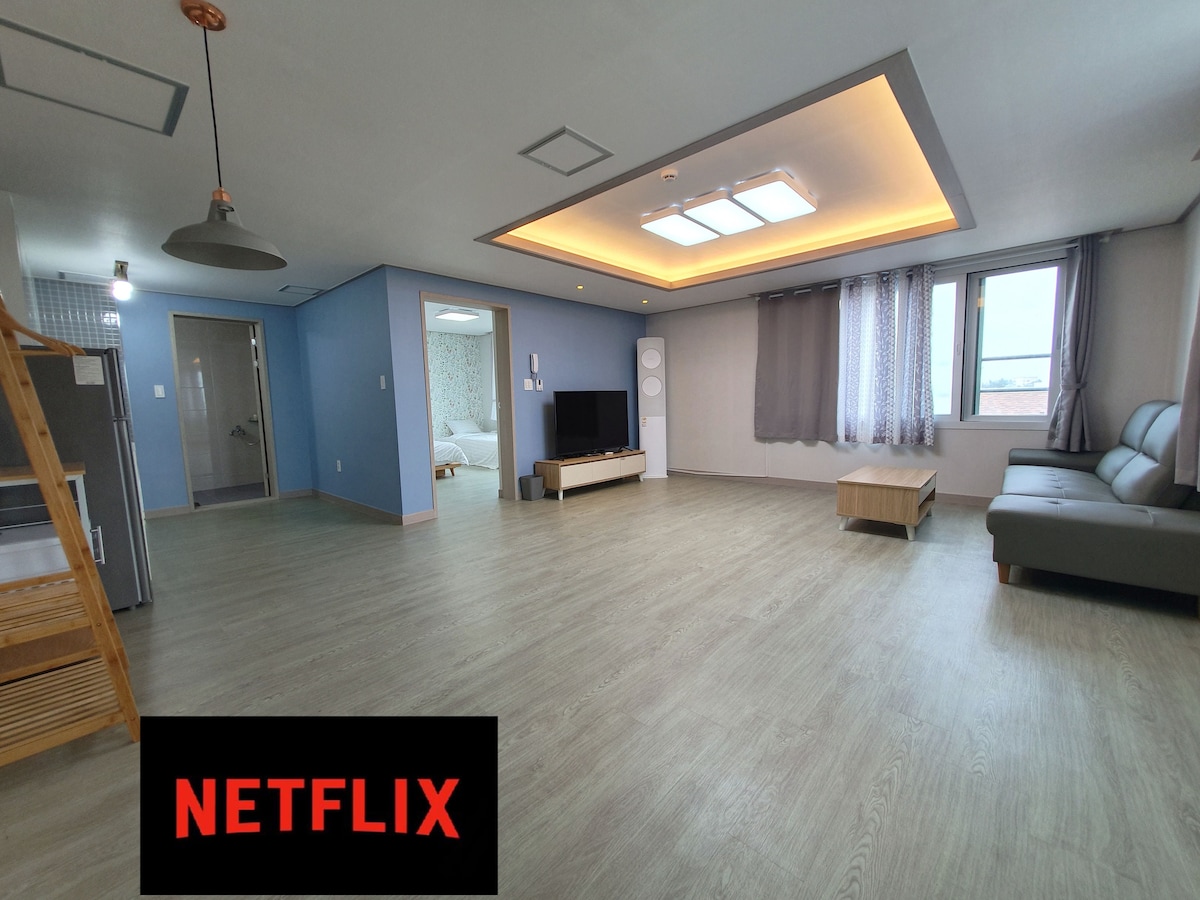 Hola. Queremos crear un espacio que te haga olvidar la congestión del centro de la ciudad con el sonido de las olas del mar. Nuestro espacio, que se encuentra a 20 minutos del aeropuerto, ofrece vistas al mar azul de Jeju desde todas las habitaciones. Composición del espacio Espacio de 12 pyeong de 3 pisos de altura (con ascensor) 1. Espacio de dormitorio : La habitación es un espacio tipo estudio con cocina. Cama, TV de pared, mesa de té y mesa para dos, perchero, soporte, fregadero, aire acondicionado, frigorífico pequeño (congelador separado), inducción 2. Cocina : Platos y utensilios de cocina para 2 personas 3. Baño : Ducha de girasol, toallas, champú, acondicionador, gel de baño, jabón, papel higiénico (por favor, tenga en cuenta que no es posible proporcionar cepillos de dientes debido a la Ley de Control de Higiene). 4. Terraza 5. Zona de barbacoa Ocean barbacoa conectada al mar: 20 000 wones (proporcionamos carbón y parrilla). Al lado del vestíbulo, hay un área de barbacoa separada en caso de lluvia. 6. Estacionamiento: Estacionamiento eléctrico disponible. 7. Solicite por separado la lavandería y la secadora en la entrada del primer piso. Gracias.