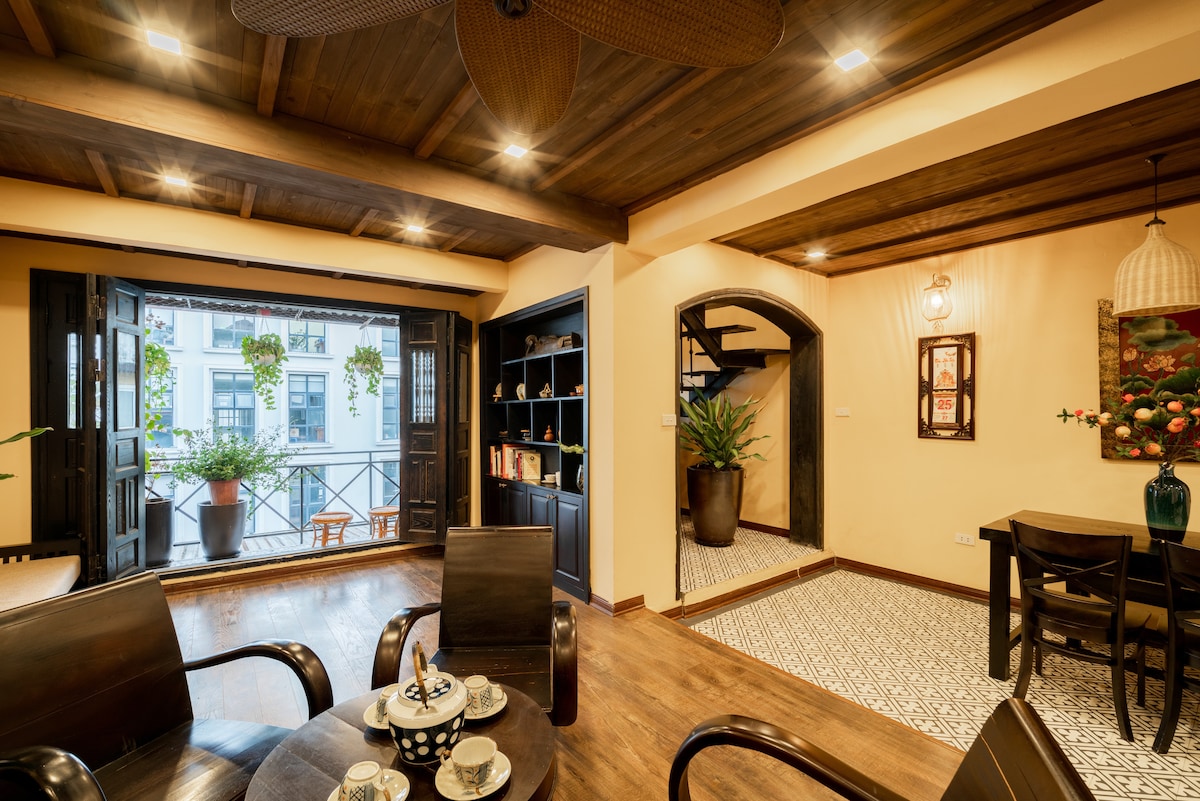Grandpa - Una acogedora casa de familia en el corazón del casco antiguo de Hanói. Ubicado en una calle tranquila y arbolada a solo 400 m de la Casa de la Ópera, este apartamento iluminado por el sol de 40 m² ofrece 1 dormitorio con 2 camas tamaño queen, una cálida sala de estar con proyector (Netflix/YouTube), cocina totalmente equipada, baño espacioso, balcón frondoso, wifi de 300 Mbps y estacionamiento gratuito. Ubicado en el tercer piso a través de las escaleras (sin ascensor). Apto para familias, céntrico, con luz suave, escalera vintage y ambiente tranquilo: una suave porción de la antigua Hanói.