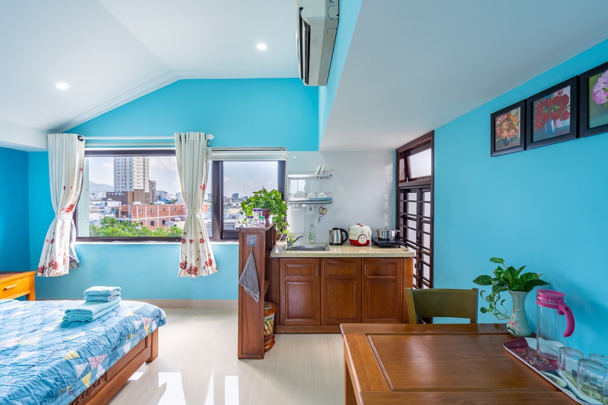 Với vị trí thuận lợi, phong cảnh yên bình, yên tĩnh và sạch sẽ tạo nên không gian sống thoải mái, lãng mạn và hết sức hấp dẫn. Blue Apartment sẽ mang lại cảm giác thư giãn và yêu thích cho kỳ nghỉ dài hạn của bạn. Giường ngủ êm ái, chăn ga gối vãi cotton cao cấp, ánh sáng tự nhiên bên cửa sổ lớn. Không gian làm việc với bàn ghế ngồi thoải mái, Internet tốc độ cao. Phòng tắm nước nóng với máy giặt đời mới hiện đại kháng khuẩn cao…. Rất hân hạnh được đón tiếp.