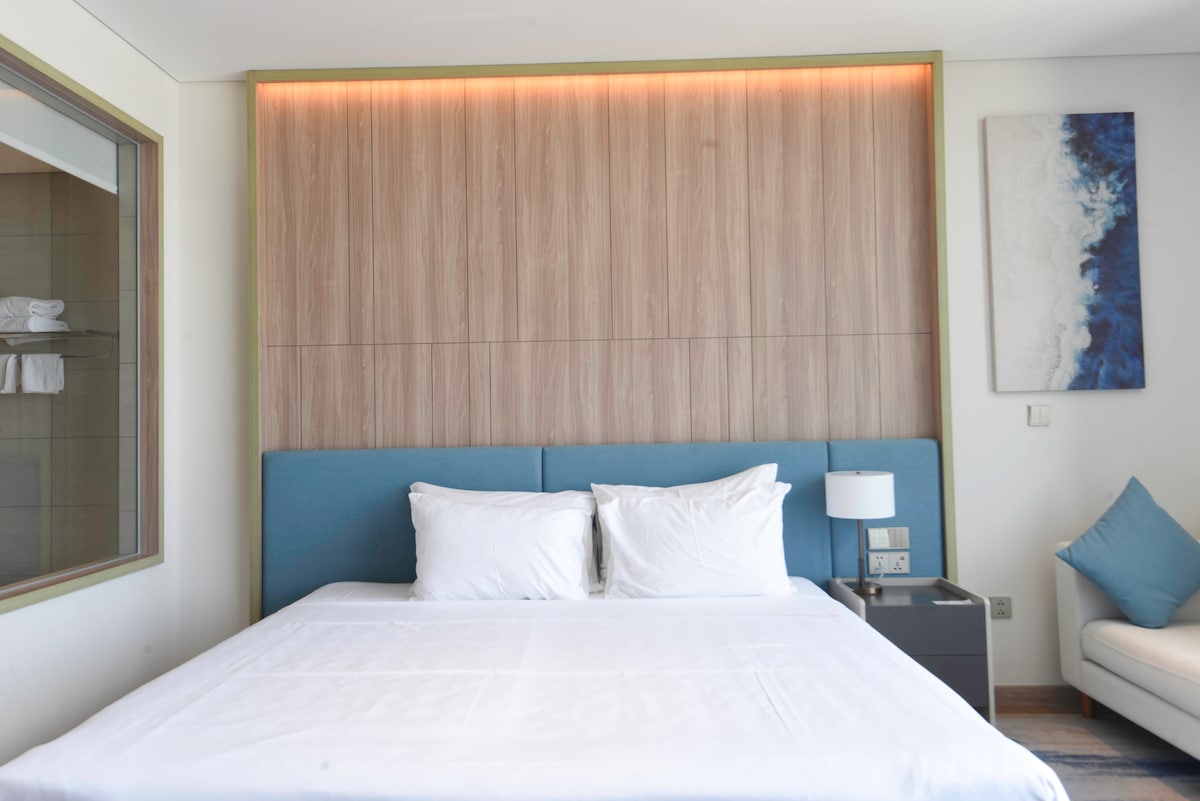 ✨ Despiértate con el brillante mar azul, echa un vistazo al sereno lago y las majestuosas montañas, y disfruta de las vibrantes luces de la ciudad por la noche, ¡todo desde un impresionante estudio en esquina! 🏠 LO más destacable: • Amplio apartamento en esquina de 48 m² con vistas panorámicas. • 4 vistas impresionantes en 1: horizonte de la ciudad, lago tranquilo, cordillera, horizonte del océano. • Cama tamaño king (1,8 m x 2 m) + sofá cómodo. • Lavadora-secadora para estadías largas + secador de pelo incluido. • Interior moderno, luminoso y acogedor con grandes ventanales.