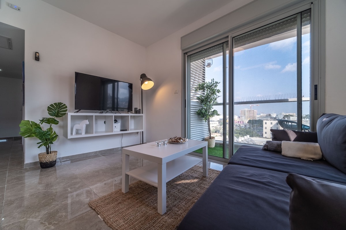 Un cálido apartamento en el quinto piso de un nuevo y lujoso edificio en el centro de Haifa, a pocos pasos del transporte público: tren, autobús y teleférico, y cerca de la colonia alemana, el puerto de Haifa y los Jardines Bahá'í. La zona tiene bares, restaurantes y cafeterías. El departamento tiene un enorme balcón con unas vistas inmejorables a la ciudad, al monte Carmel y al mar. Perfecto para cualquier persona que quiera disfrutar de la ciudad y estar cerca de atracciones como los Jardines Bahá'í.