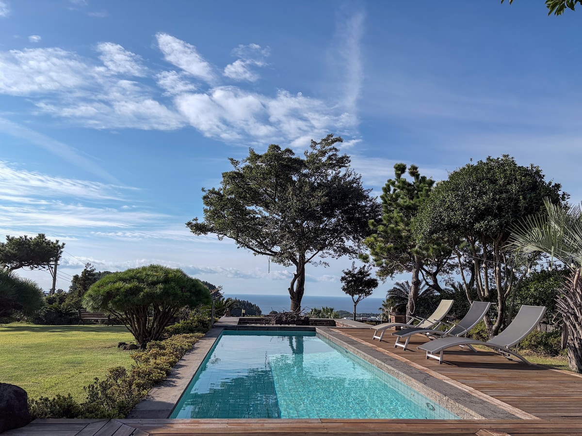 En un terreno de 427m2, hay un jardín de césped verde, una cubierta de piedra basáltica de Jeju y una casa de Jeju con ropa de color rosa encima de una cubierta de madera. En el patio de césped verde hay una sombrilla junto a un árbol de mandarina para tomar el sol y descansar, y una mesa de fuego para pasar tiempo con la familia, la pareja y charlar. En la cubierta de madera hay una parrilla para barbacoa y un columpio, para que pueda relajarse y disfrutar de una comida en familia. Si se apoya en la silla Lilleks y mira las nubes y las estrellas del cielo nocturno que solo se pueden ver en Jeju, se sentirá relajado. Hay granjas de tórtolas y campos de cítricos en los alrededores, por lo que puede pasar el día escuchando los diversos sonidos de las aves en todas las estaciones. Las paredes blancas y los interiores de acabado de madera como acacia y mulberry hacen que el espacio sea más cálido y acogedor. Hay muchas ventanas en el interior de la casa, el techo de la sala de estar es alto, es agradable y el interior es limpio, lo que es suficiente para quedarse en la casa todo el día. Incluye máquina recreativa y juegos de mesa, por lo que incluso si el clima no es bueno, podrá pasar un tiempo agradable en el alojamiento, y tiene más privacidad al usar la piscina y la chimenea solo para usted.