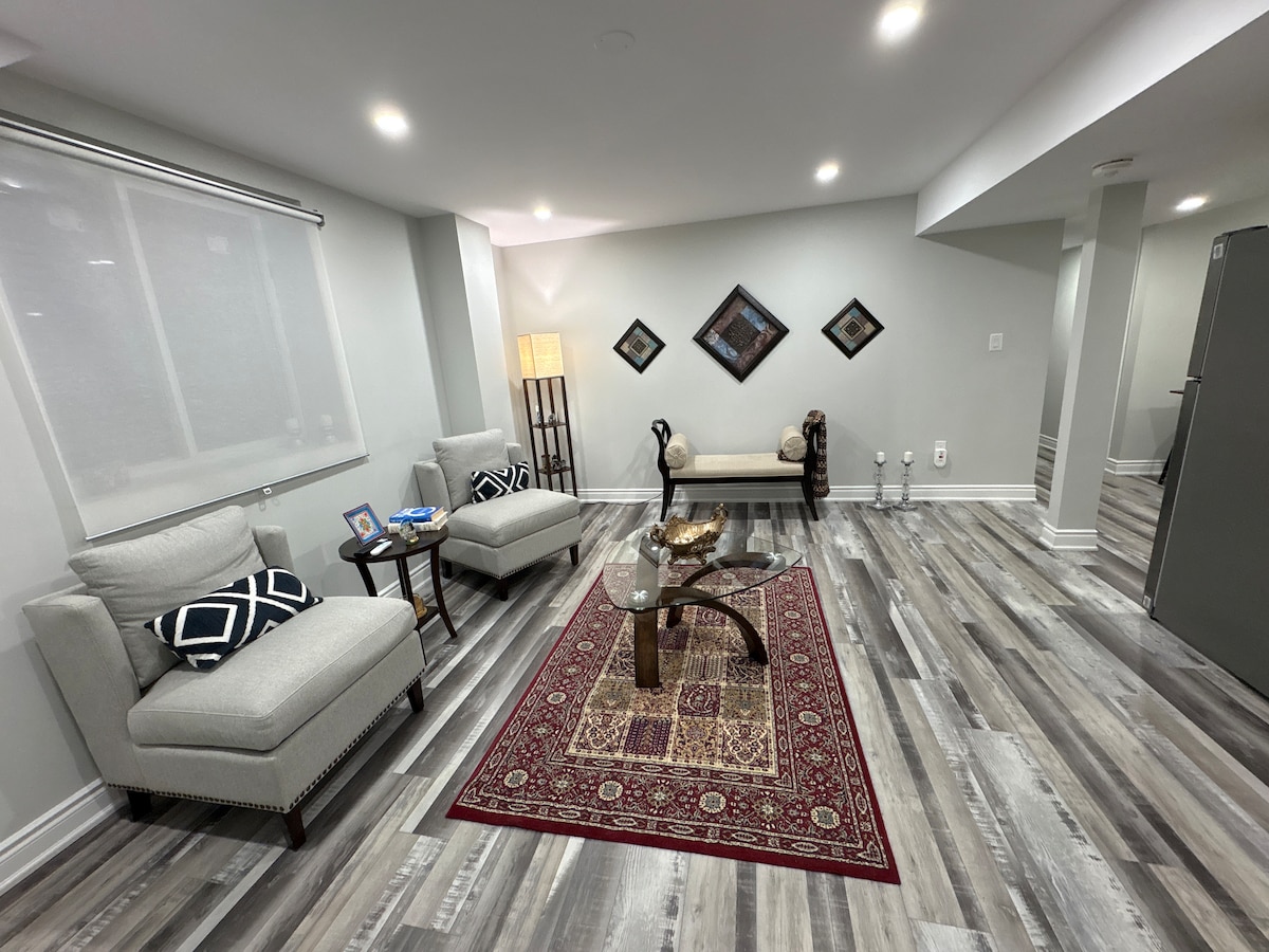 Welcome to our cozy basement apartment! This modern Airbnb is located in a peaceful residential neighborhood 40 min drive from Toronto downtown and an hour from Niagara Falls. The well-lit space features a comfortable queen-sized bed, ample storage in the spacious closet, and a beautifully designed interior with natural light flooding through large windows. Note: We have 2 single folding matresses available to place on the floor in the living room. Extra linen and pillows are provided.