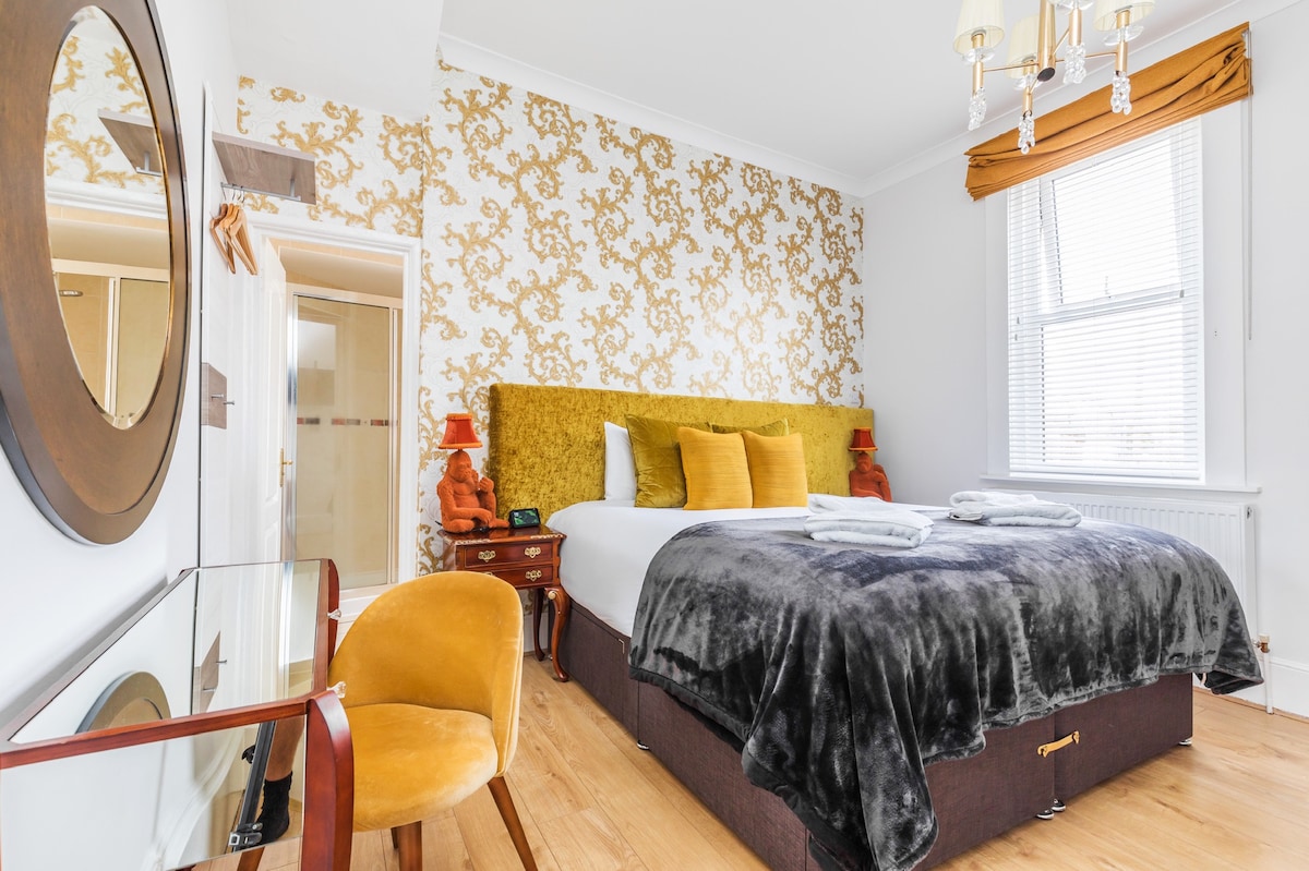 Retrocede en el tiempo en la habitación 12 en The Clarence Quarters, Southsea. Esta habitación de 28 m² en el piso superior combina el encanto de principios del siglo XIX con comodidades modernas. Disfruta de impresionantes vistas al mar desde dos grandes ventanales con vistas a Clarence Parade, Southsea Common y Solent, con vistas a la Isla de Wight y los fuertes marinos. Cuenta con una cama tamaño king, sofá cama, conexión WiFi gratuita, té/café, hervidor de agua, 2 baños compartidos y acceso a una cocina compartida. ¡No hay ascensor! Un animado pub abajo. Perfecto para parejas o familias pequeñas.
