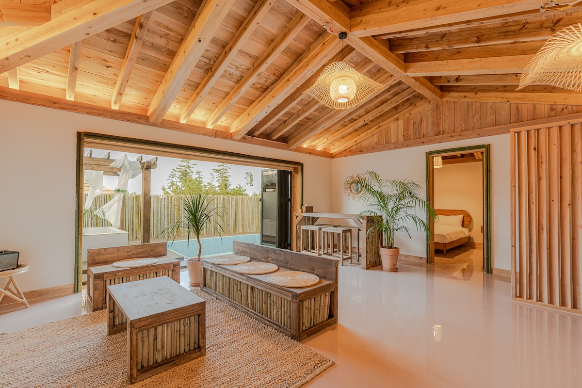 En un terreno de 427m2, hay un jardín de césped verde, una cubierta de piedra basáltica de Jeju y una casa de Jeju con ropa de color rosa encima de una cubierta de madera. En el patio de césped verde hay una sombrilla junto a un árbol de mandarina para tomar el sol y descansar, y una mesa de fuego para pasar tiempo con la familia, la pareja y charlar. En la cubierta de madera hay una parrilla para barbacoa y un columpio, para que pueda relajarse y disfrutar de una comida en familia. Si se apoya en la silla Lilleks y mira las nubes y las estrellas del cielo nocturno que solo se pueden ver en Jeju, se sentirá relajado. Hay granjas de tórtolas y campos de cítricos en los alrededores, por lo que puede pasar el día escuchando los diversos sonidos de las aves en todas las estaciones. Las paredes blancas y los interiores de acabado de madera como acacia y mulberry hacen que el espacio sea más cálido y acogedor. Hay muchas ventanas en el interior de la casa, el techo de la sala de estar es alto, es agradable y el interior es limpio, lo que es suficiente para quedarse en la casa todo el día. Incluye máquina recreativa y juegos de mesa, por lo que incluso si el clima no es bueno, podrá pasar un tiempo agradable en el alojamiento, y tiene más privacidad al usar la piscina y la chimenea solo para usted.