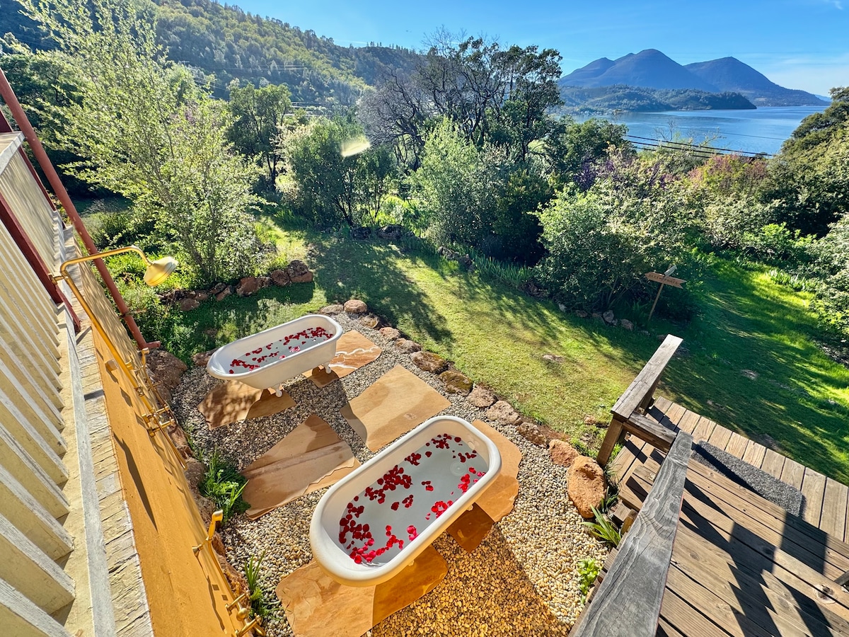 Samadhi’s Birdhouse is a quiet retreat perched atop a tiny peninsula that juts out into the southern portion of Clear Lake reaching toward Mount Konocti [Mountain Woman in Pomo]. Water surrounds you on all sides as birds abound. You’ll see pelicans streaming past; egrets finding their familiar ground; eagles, hawks, and turkey vultures looking down in curiosity. Deer, jackrabbits, and wild turkey graze together while melodic birdsong fills the air.