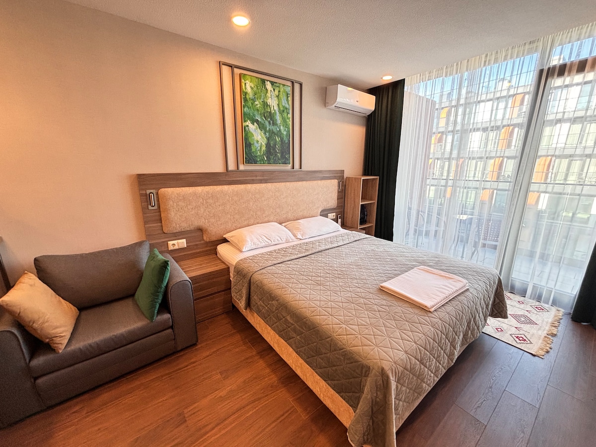 Relájate en este acogedor departamento de 1 dormitorio en el lujoso complejo Greenside Gonio, a solo unos pasos de la playa del mar Negro. Impresionantes vistas al mar y a las montañas desde tu balcón en un entorno que combina comodidad y elegancia. Como parte de Greenside Gonio, disfrutarás de servicios de clase mundial: Nada durante todo el año en la piscina cubierta o en la piscina al aire libre de temporada. Mantente en forma en el gimnasio de última generación o relájate en el spa. Saborea deliciosas comidas en el restaurante del hotel y disfruta de servicios de recepción las 24 horas, los 7 días de la semana.