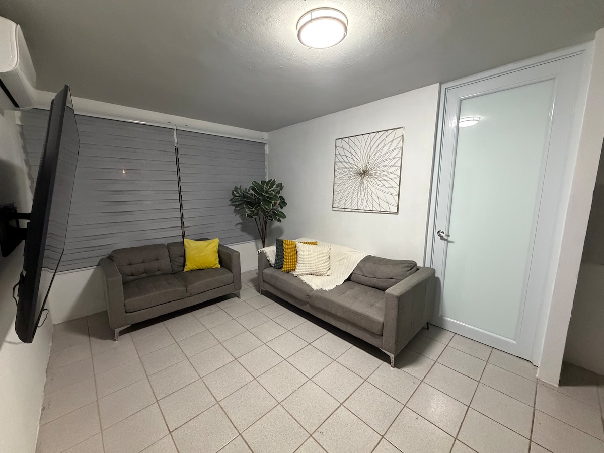 Acogedor apartamento de dos habitaciones, con cama Queen en una habitación y dos camas twin en la otra. Aire inverter en cada habitación. Cocina con nevera, estufa, microondas, maquina café expreso, tostadora y para pop corn. Estacionamiento gratuito. Cuenta con juego cocina, vasos y platos. A 10 minutos del aeropuerto, Playa de Isla Verde; a 12 minutos de Plaza Las Americas, Choliseo; 15 mins. Viejo San Juan. 5 mins Tren Urbano; restaurantes, hospitales, bancos, Universidad y EDP College.