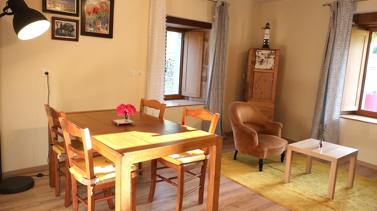 Dans un cadre bucolique, venez goûter au charme simple et authentique d'un ancien corps de ferme, au calme avec une vue incroyable sur la vallée. Vous bénéficiez d'une entrée privative. L'accès au jardin n'est pas direct par la maison mais vous y êtes les bienvenus (commun avec les propriétaires). Logement traversant Est/ Ouest. Une dépendance peut permettre de ranger les vélos. Stationnement aisé.
